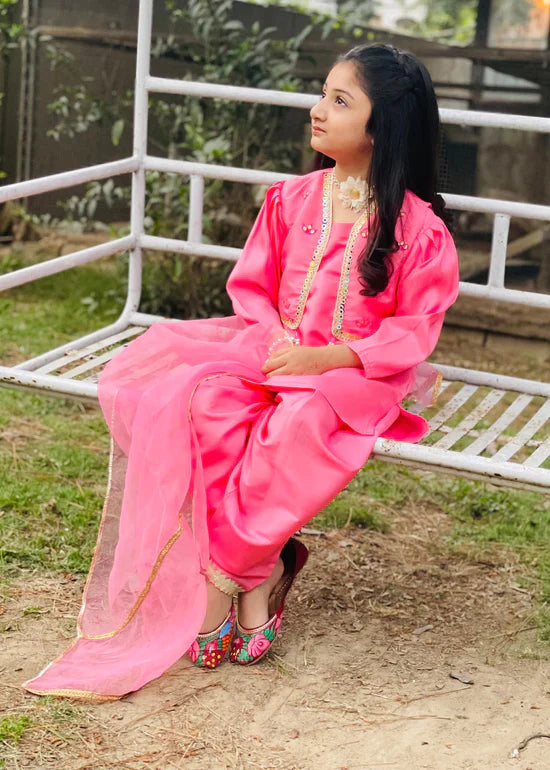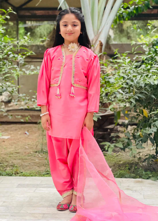 Description: Pink is always the best! This beautiful raw silk bolero comes in a beautiful shade of pink and is embellished with delicate details and tessels on the front. It will make your little girl look very elegant on Eid or any other special occasion!