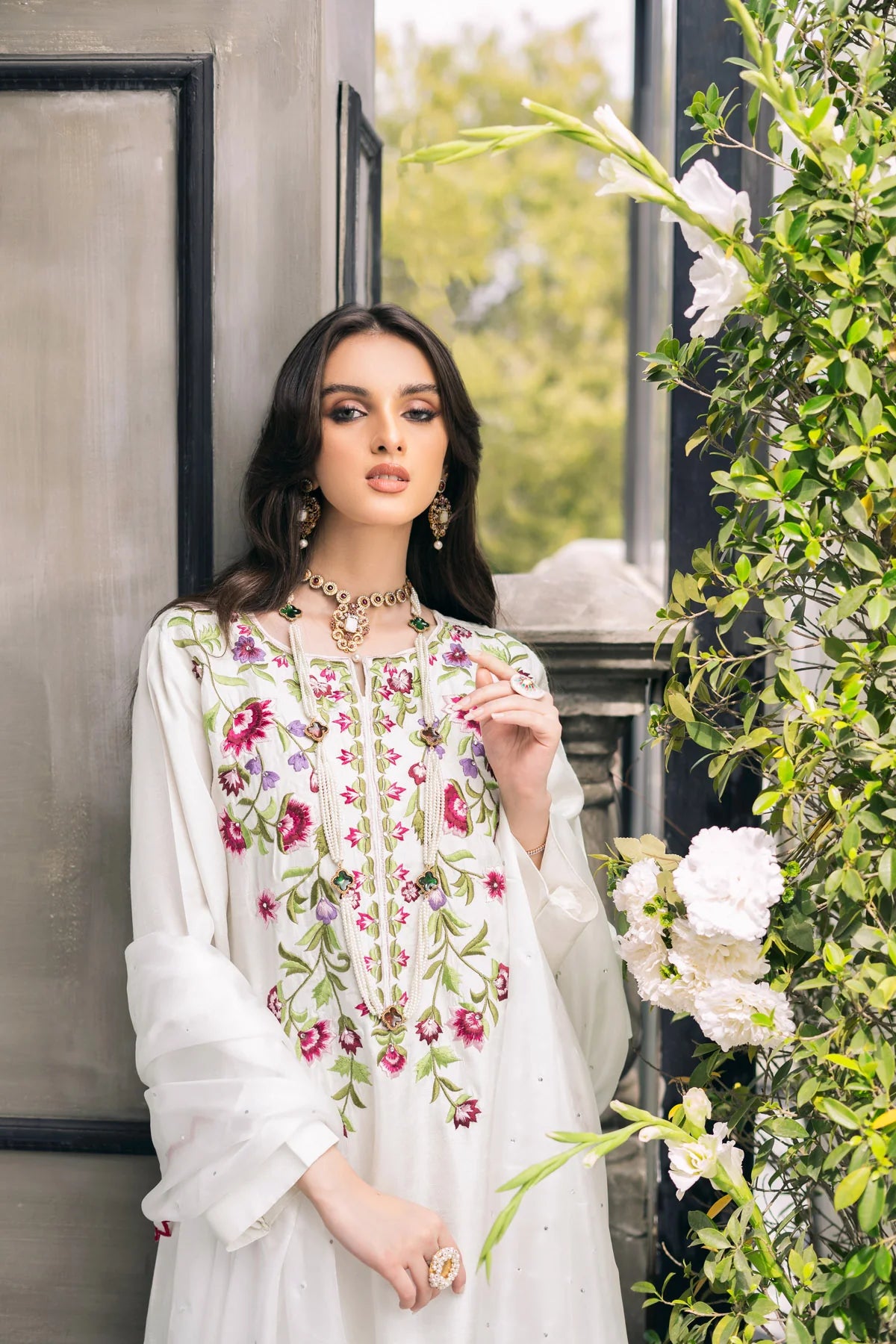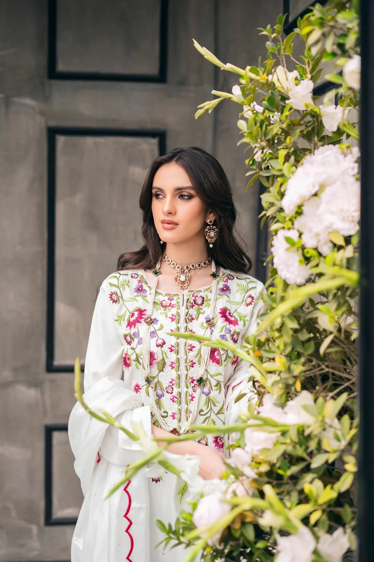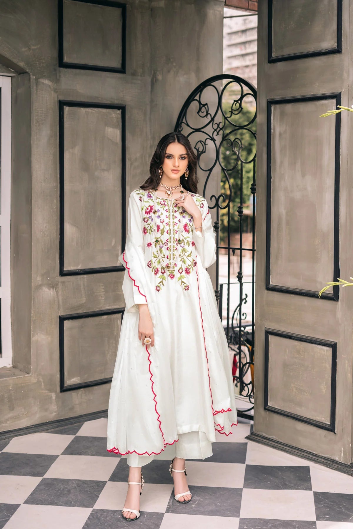 Our first ever collection encloses an ethereal White raw silk outfit. The Korean raw silk offers somewhat regal rigidity with embroidered silver stone work on the neck line contributing colours to the whole outfit. The outfit follows a bottom of Korean raw silk Colutte and China Silk Dupatta covered in pink scallops and silver stone chatta work.