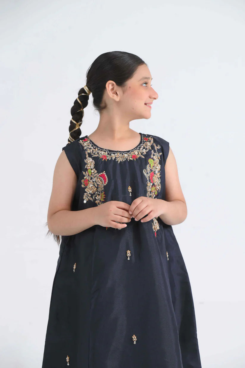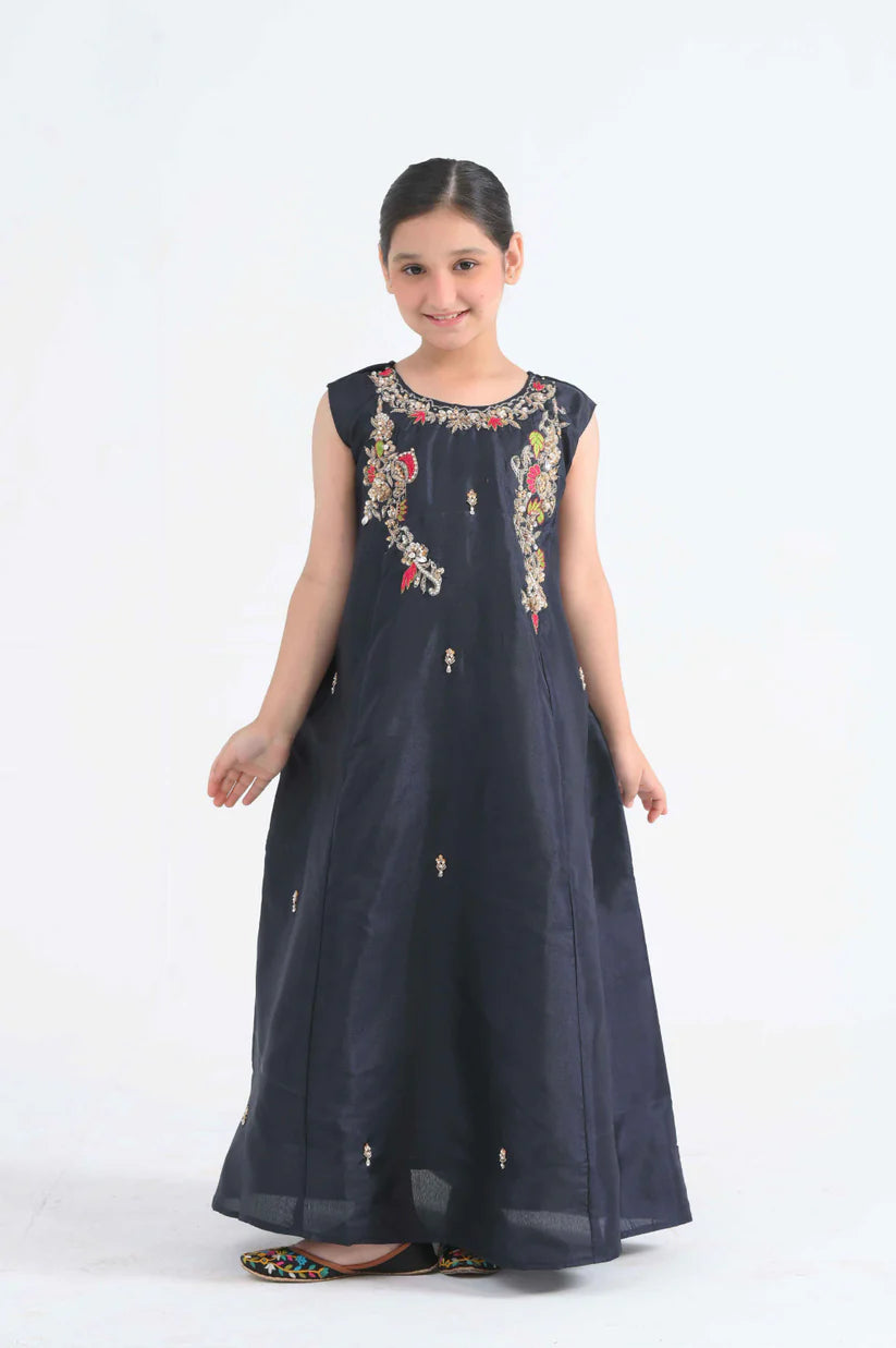 Rouge black is definitely a fairytale dress that touches the floor and makes you feel like a princess. This kataan silk, floor length frock is embellished with adda work, detailed with sitara pearls and everything good for you to shine.