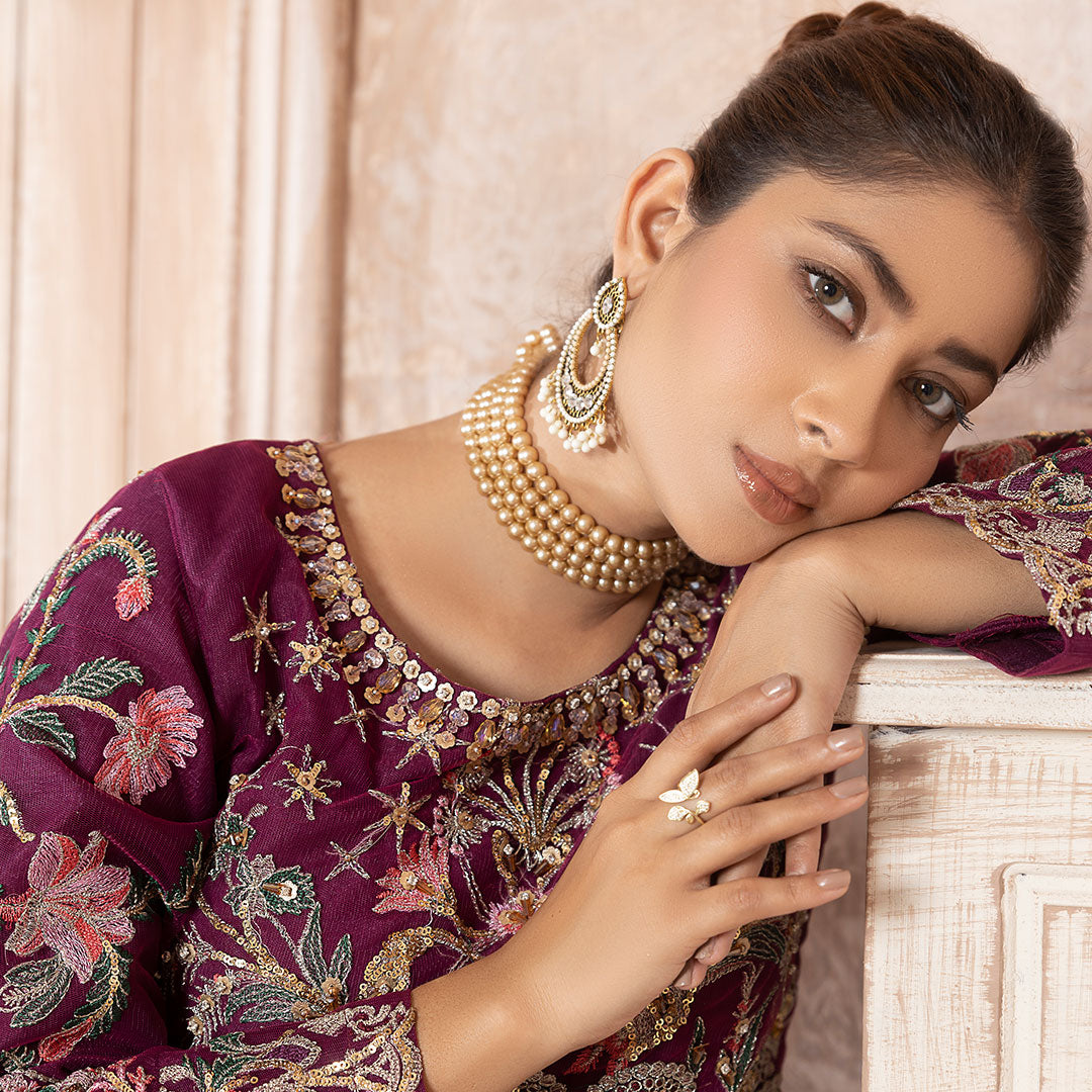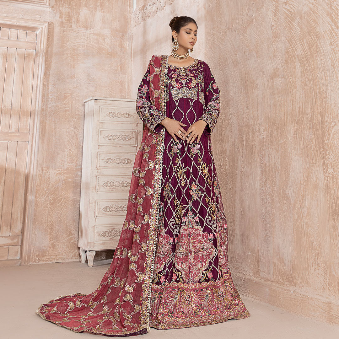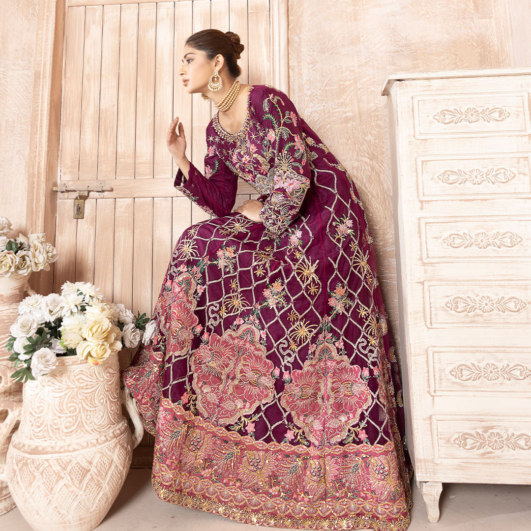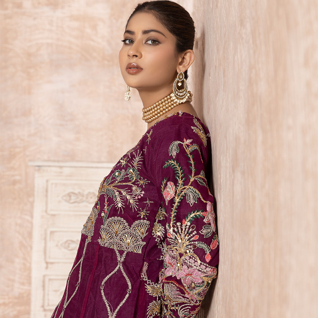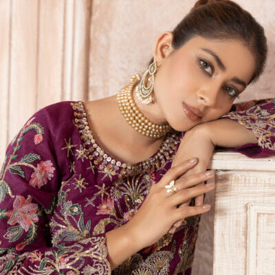 Step into royalty with our “Royal Vines” dress, a majestic creation that combines maroon and purple hues to create a luxurious look. The maxi dazzles with heavy embroidered floral bunches, creating a rich tapestry of colors and textures. The carrot-colored dupatta, with its heavy embroidered border, adds a contrasting yet harmonious touch, making this ensemble fit for a queen.