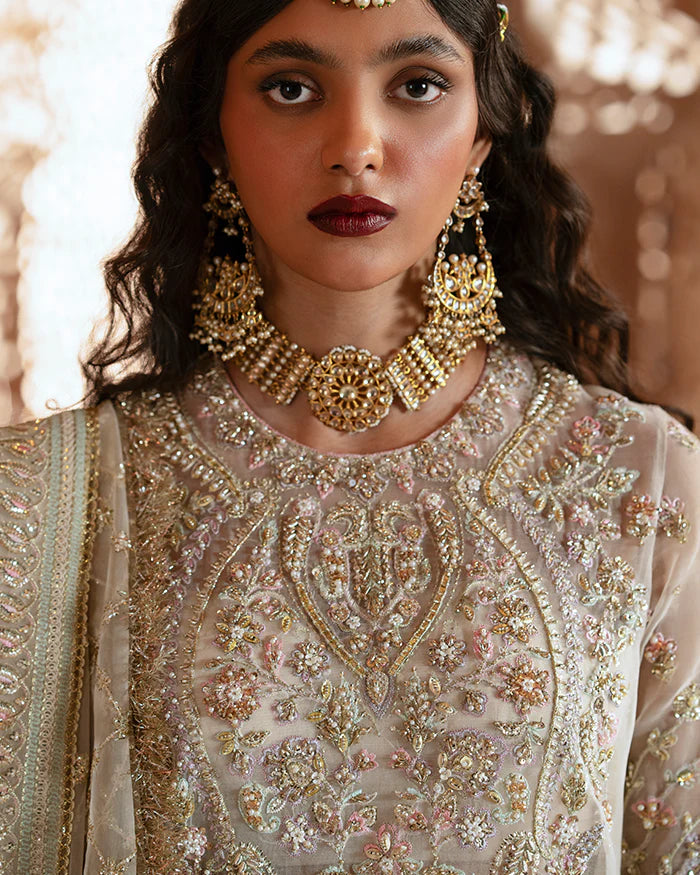 This wedding ensemble is a tribute to the serene yet powerful presence of Ruhaani Begum crafted for a bride who exudes royalty, purity, and timeless charm. Step into your wedding day as a true Empress, draped in an heirloom of Mughal magnificence.