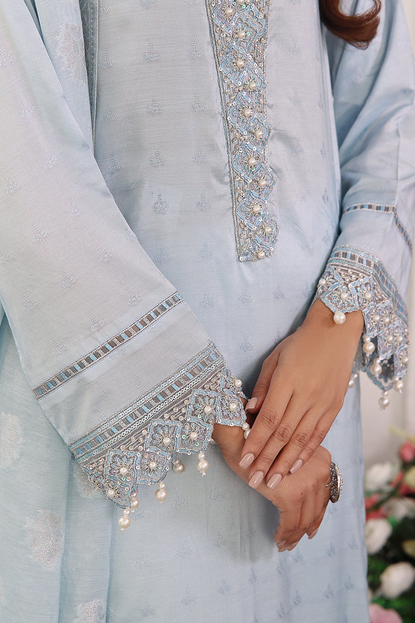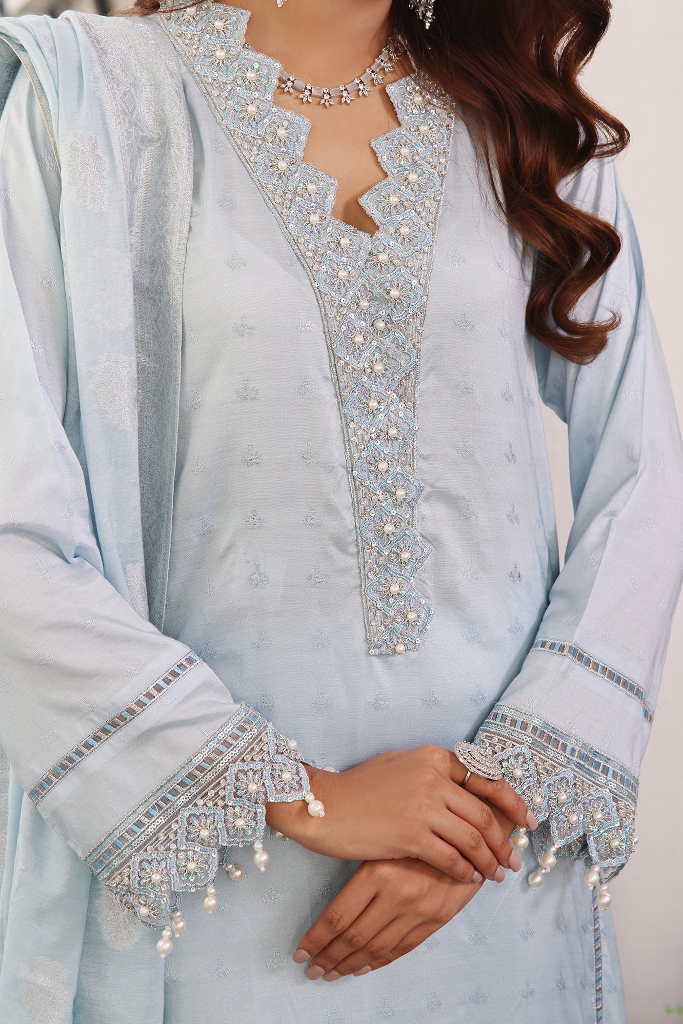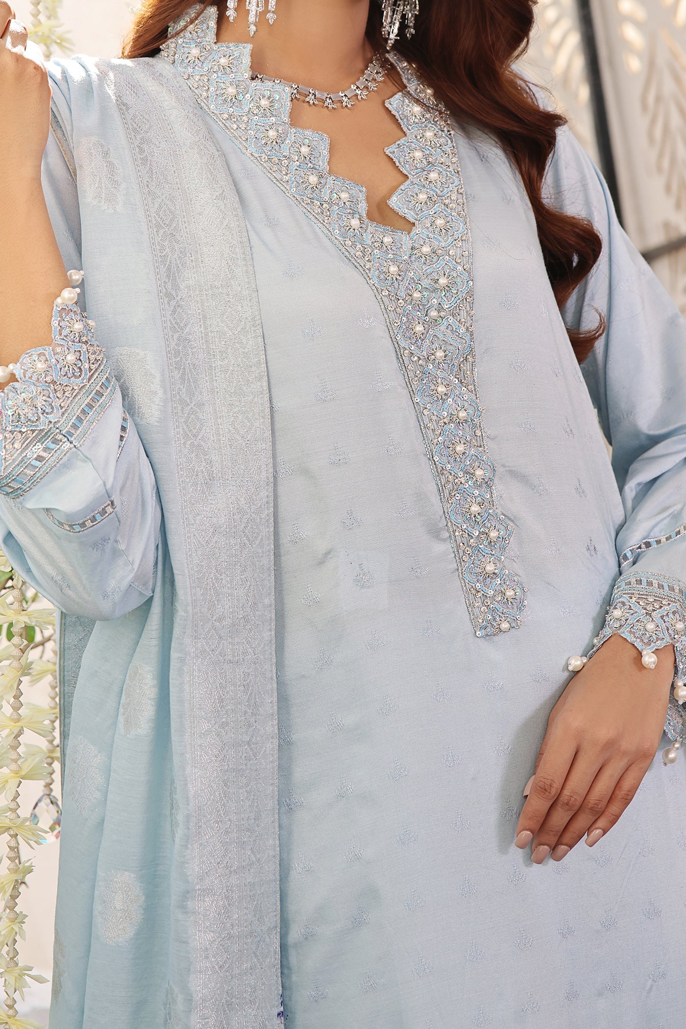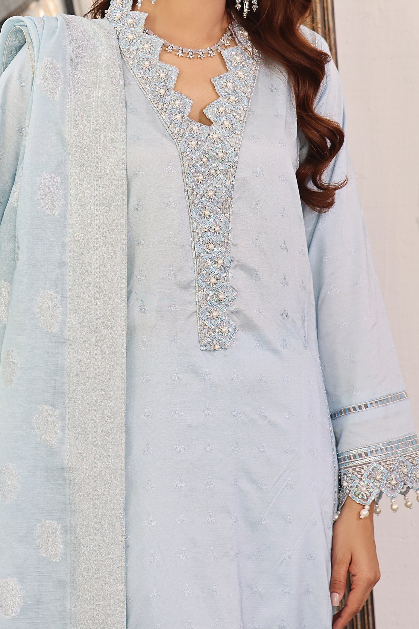 Achieve a stunning, show-stopping look with this luxurious traditional ensemble. A beautiful jacquard ice blue adorned with mesmerizing embroidery and scintillating embellishments, a classic straight trouser with a captivating embellished dupatta completes this aesthetically rich composition, making it a perfect style statement for all your festive soirées.