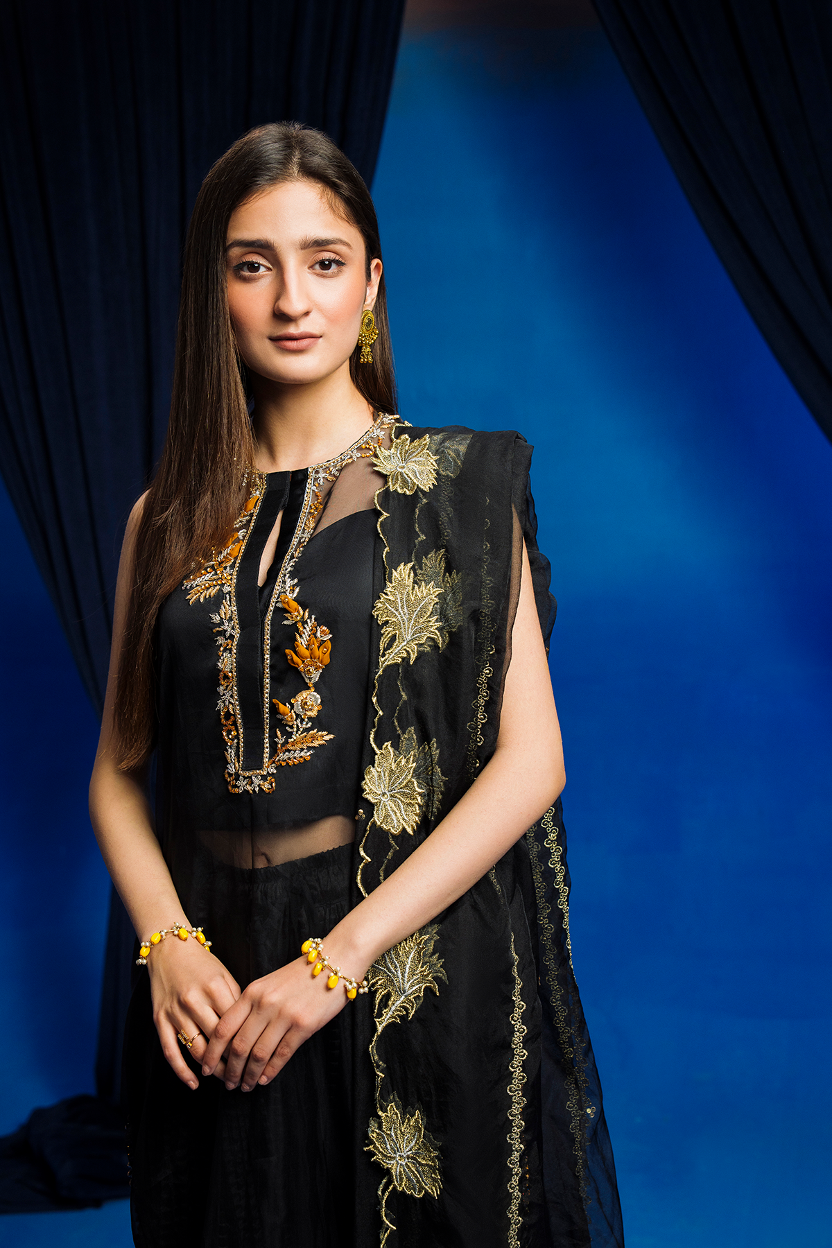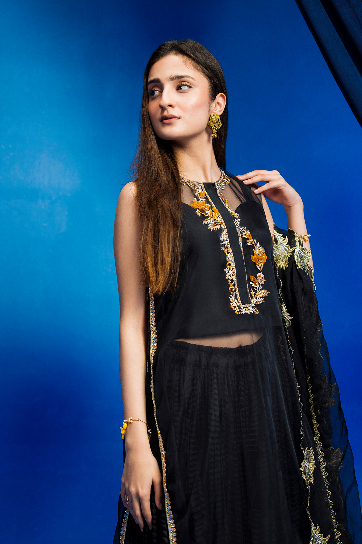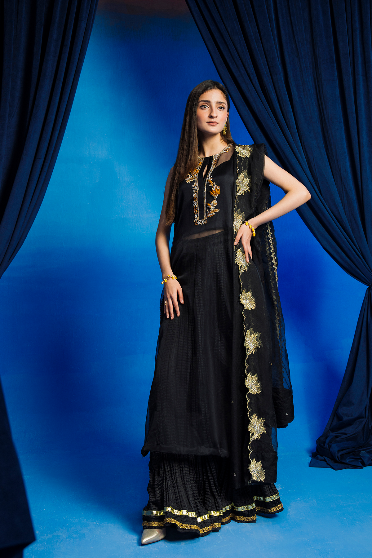 Radiate elegance in a crushed black gharara, adorned with golden embroidery. Layered with a sheer black shirt, it adds allure and sophistication. Paired with a subtly detailed dupatta, this ensemble is perfect for special occasions. Embrace timeless charm and captivate the crowd in this stunning ensemble.