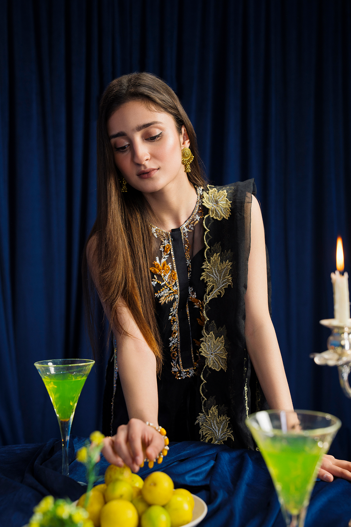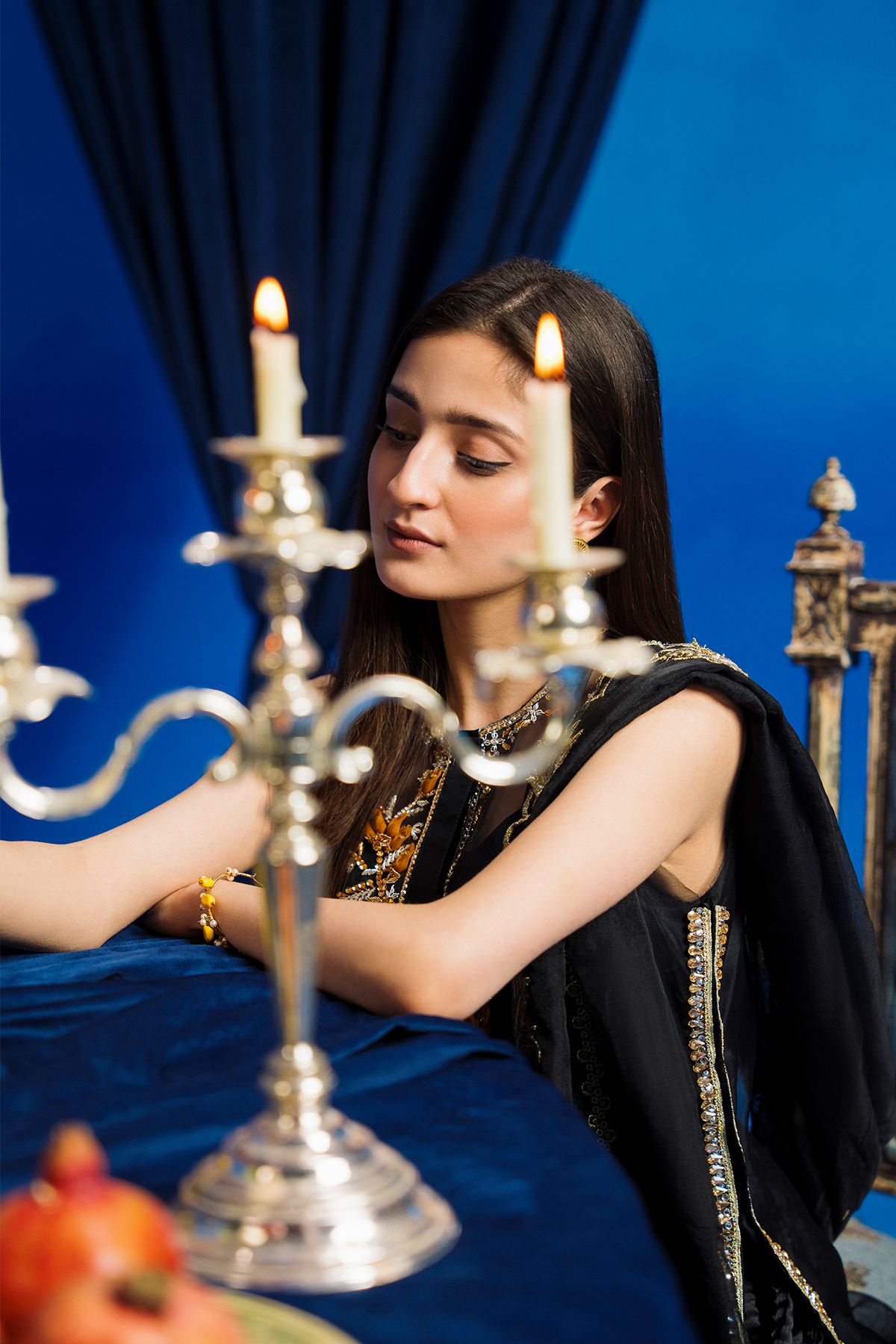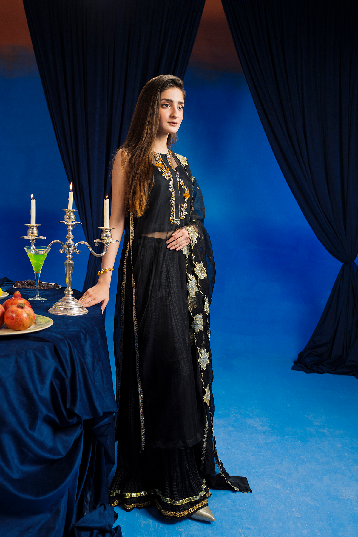 Radiate elegance in a crushed black gharara, adorned with golden embroidery. Layered with a sheer black shirt, it adds allure and sophistication. Paired with a subtly detailed dupatta, this ensemble is perfect for special occasions. Embrace timeless charm and captivate the crowd in this stunning ensemble.