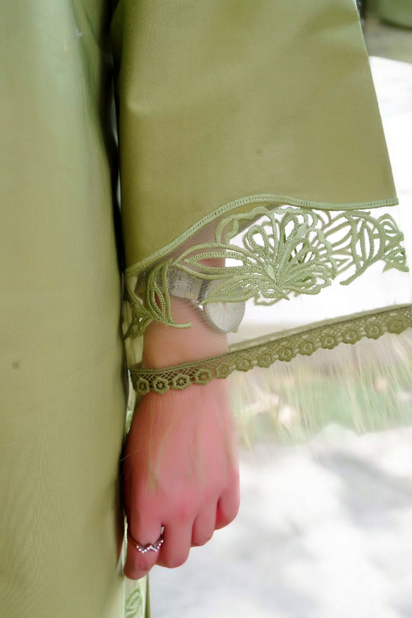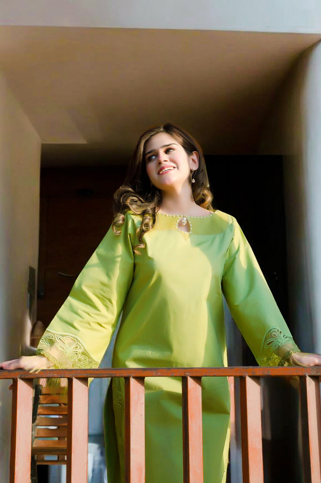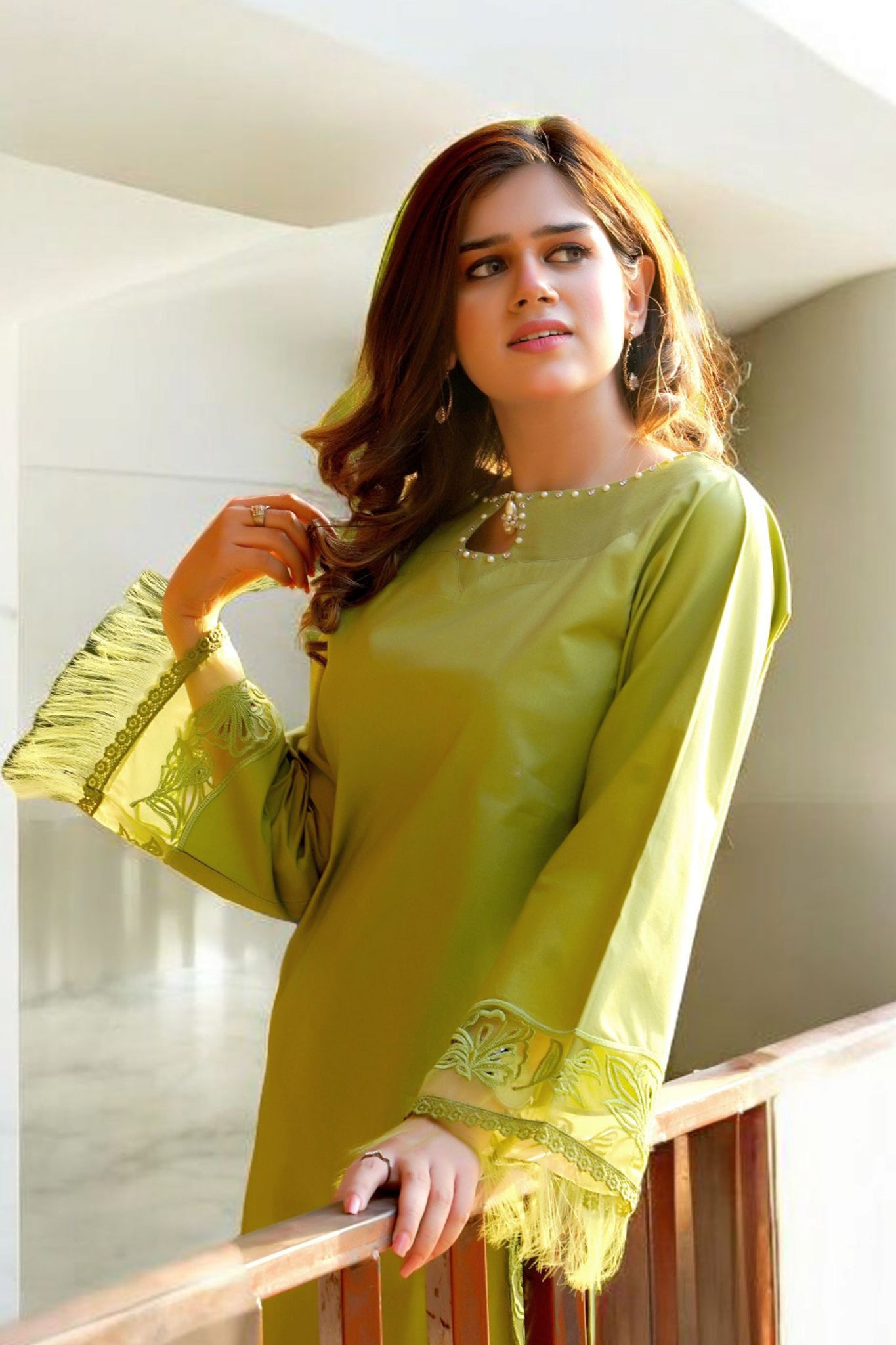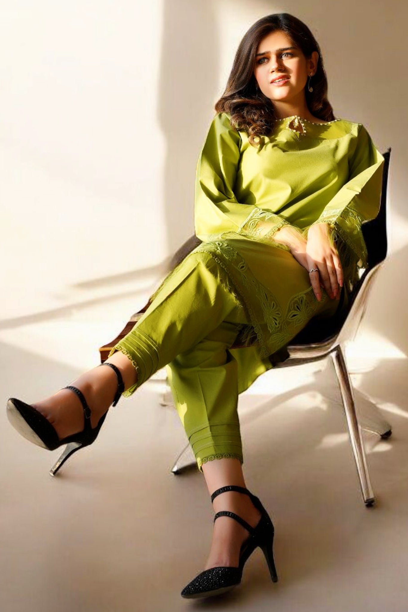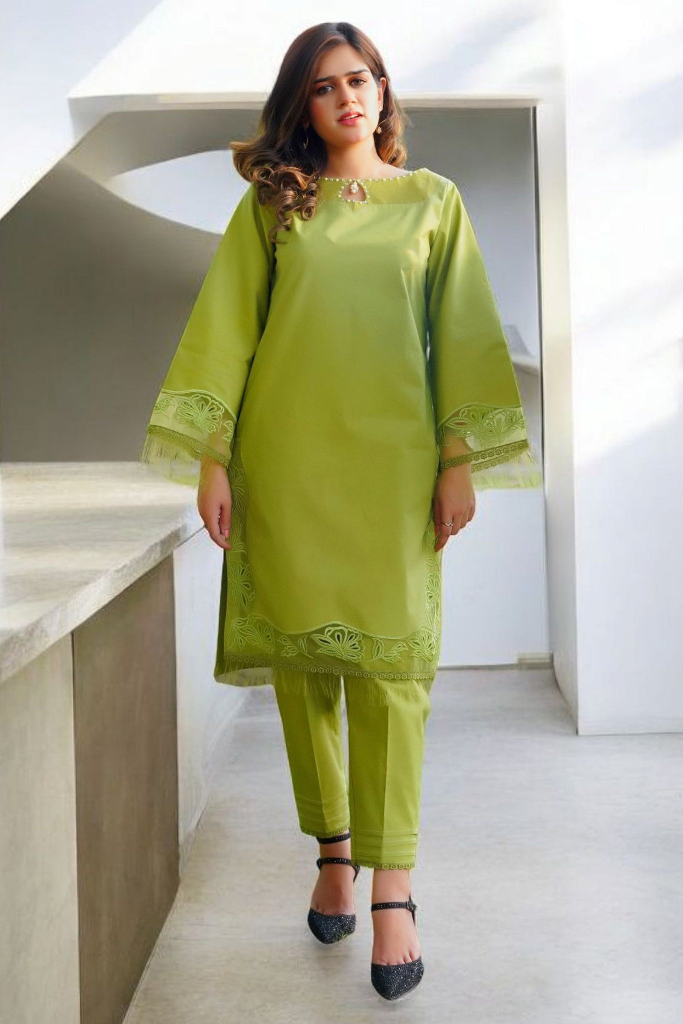 Elegant lime green two-piece dress, thoughtfully designed to captivate. The stunning ensemble features delicate cut work on the sleeves and daman showcasing meticulous craftsmanship. A beautiful pearl neckline adorned with organza adds an elegant touch, enhancing the overall sophistication. Paired with chic capri pants, this outfit perfectly balances tradition with contemporary style, making it an ideal choice for festive gatherings and special occasions.