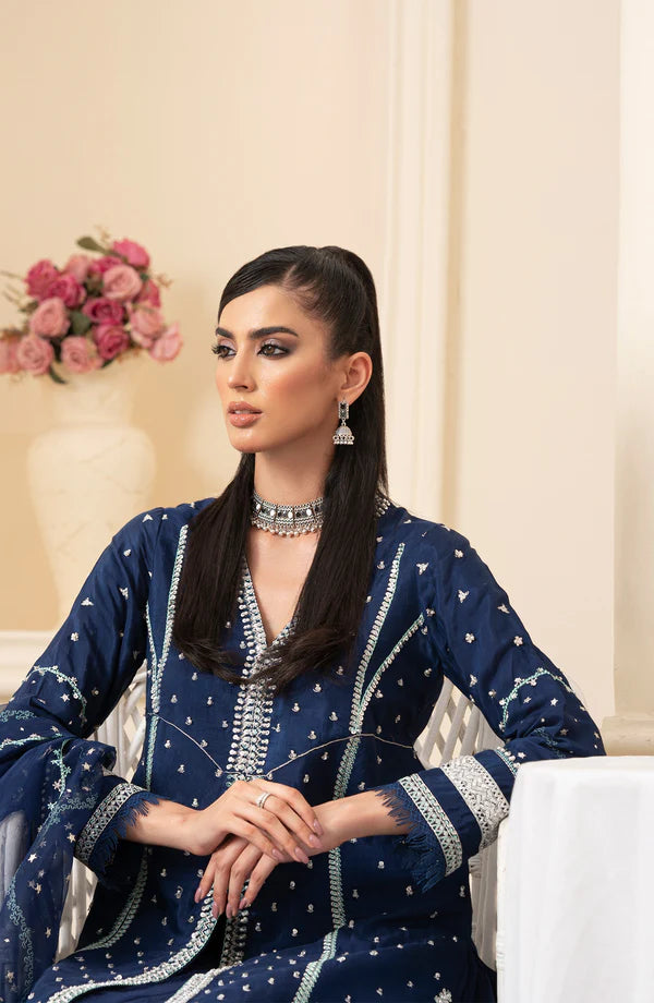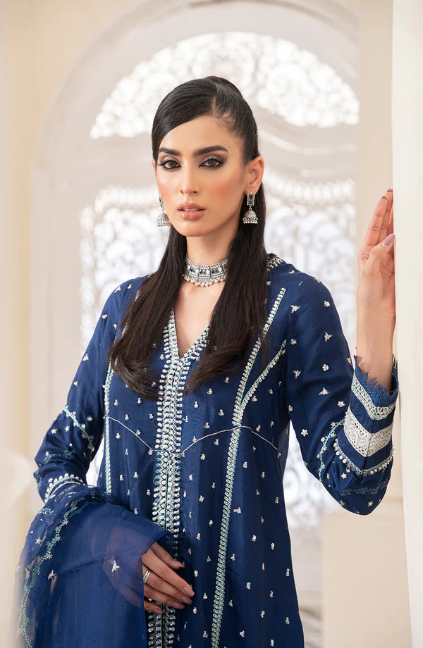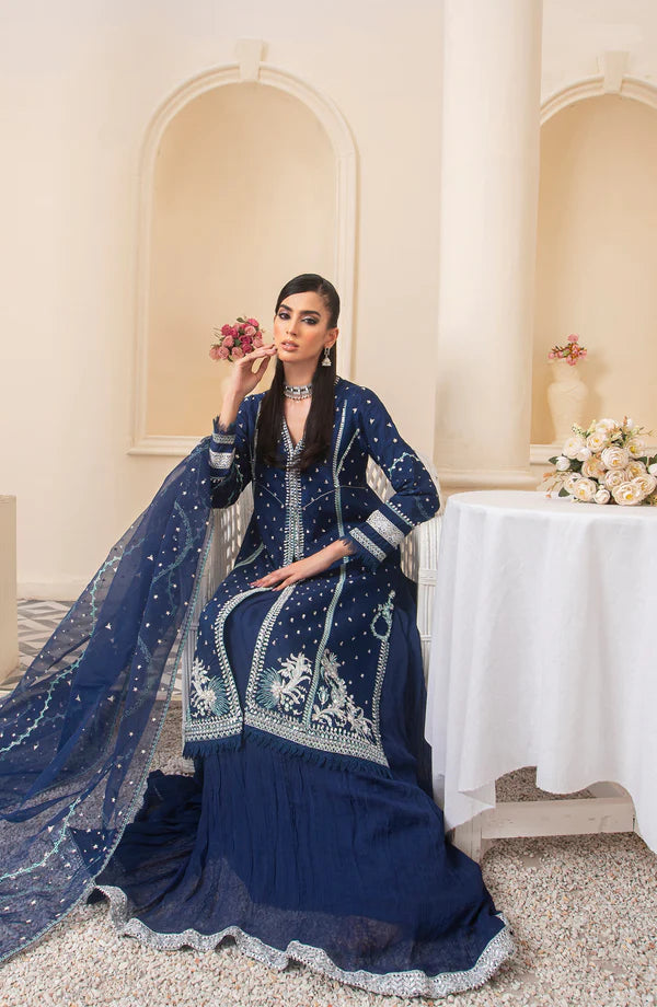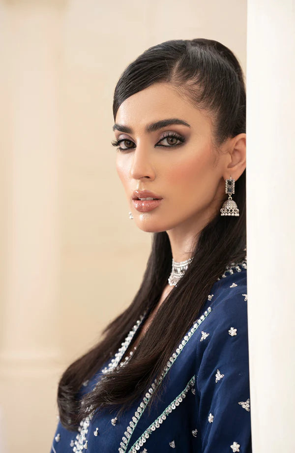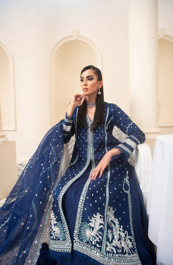This blue majestic ensemble is heavily embellished in the most elegant way. Featuring the most delicate adda work on a sophisticated summer silk fabric and a perfect blend of organza embroidered dupatta paired with banmber chiffon. A perfect choice for any special occasion.