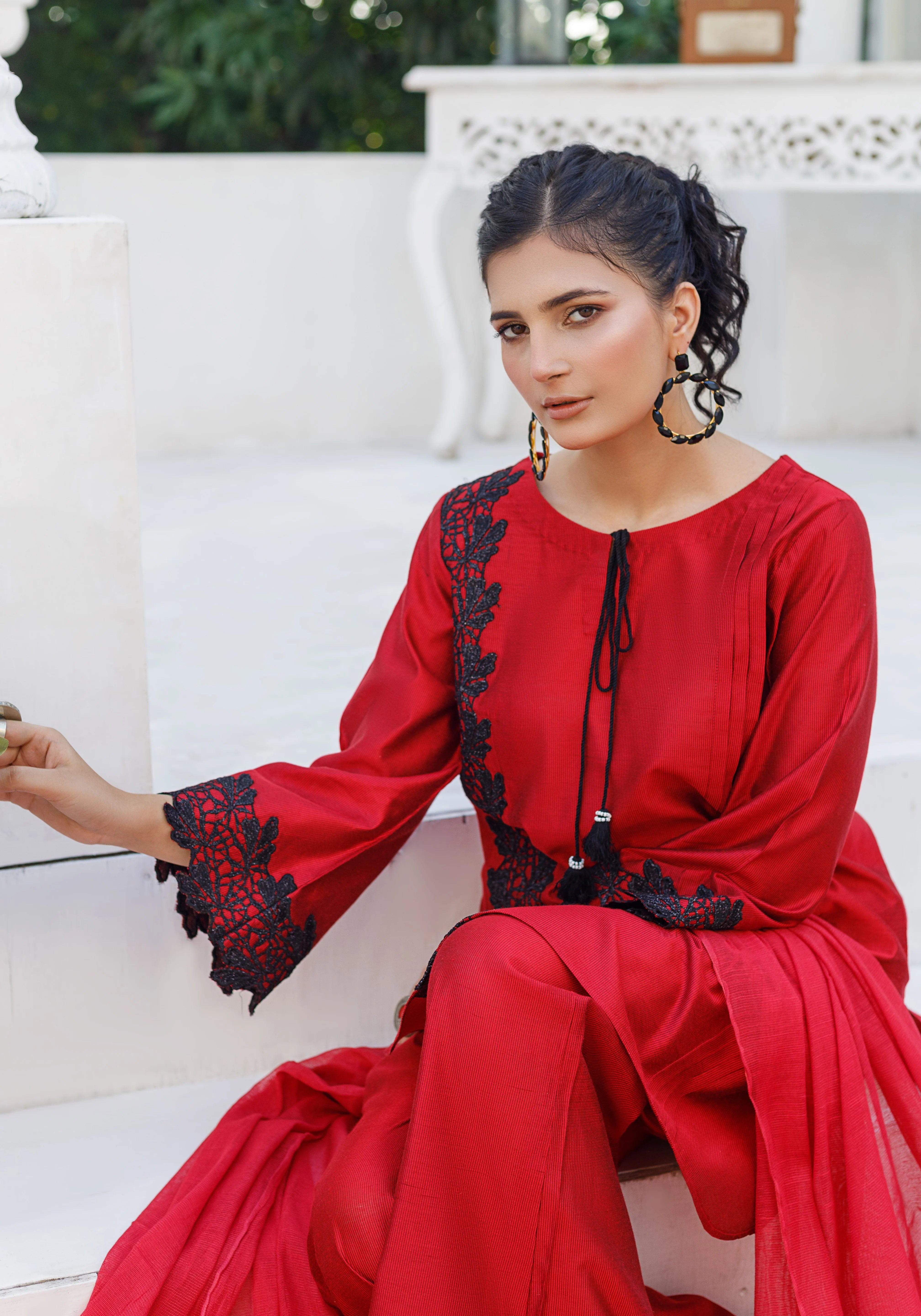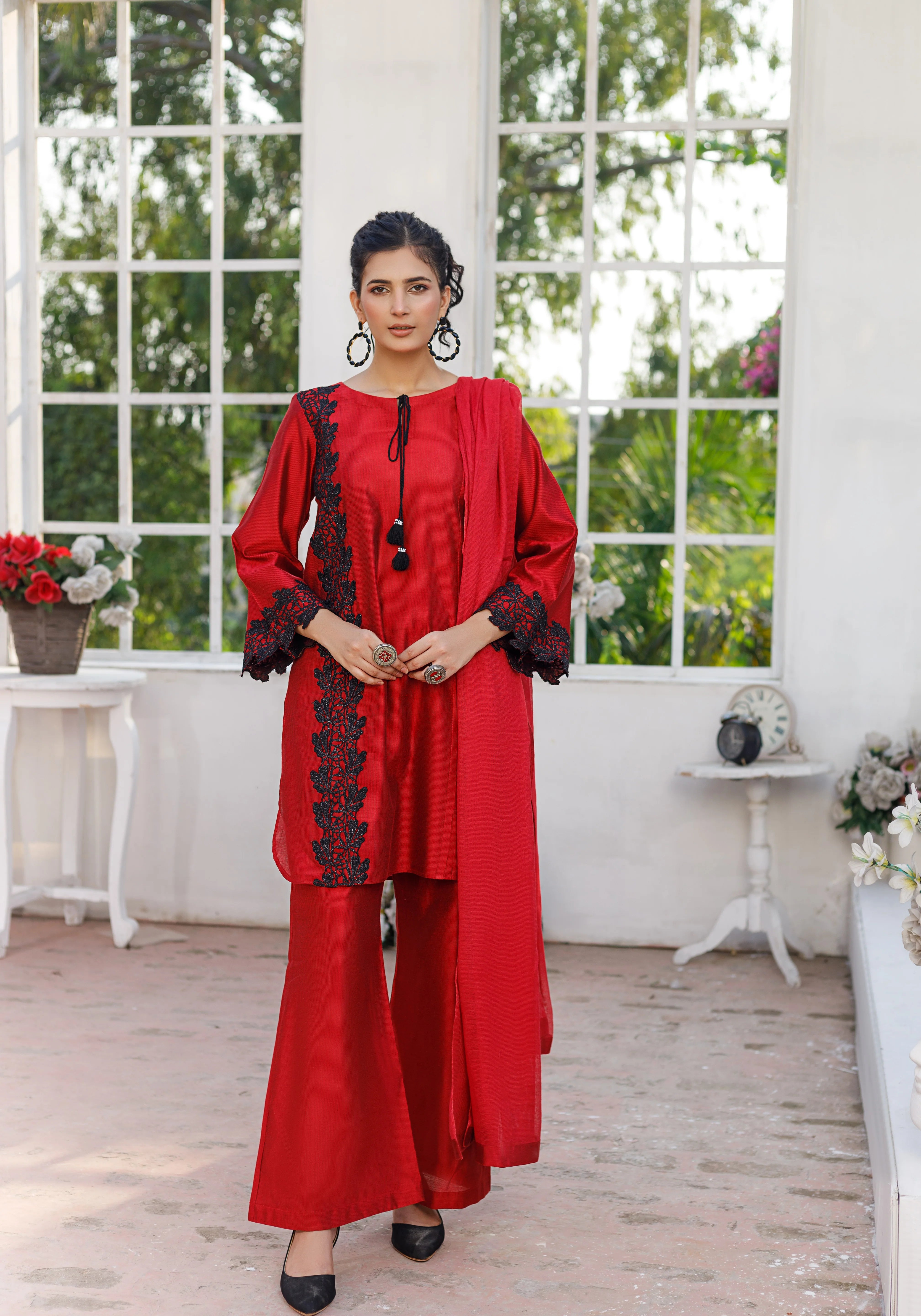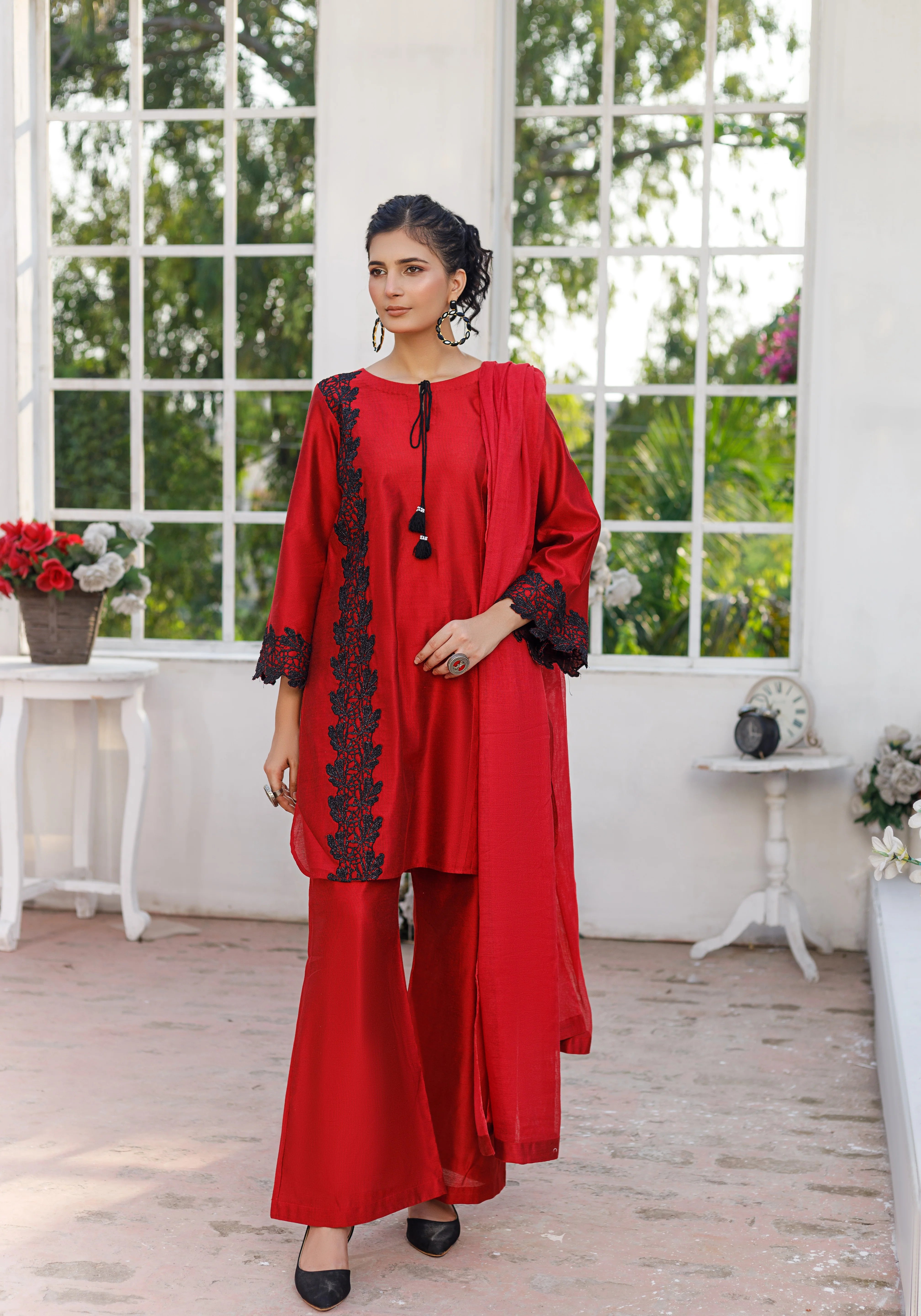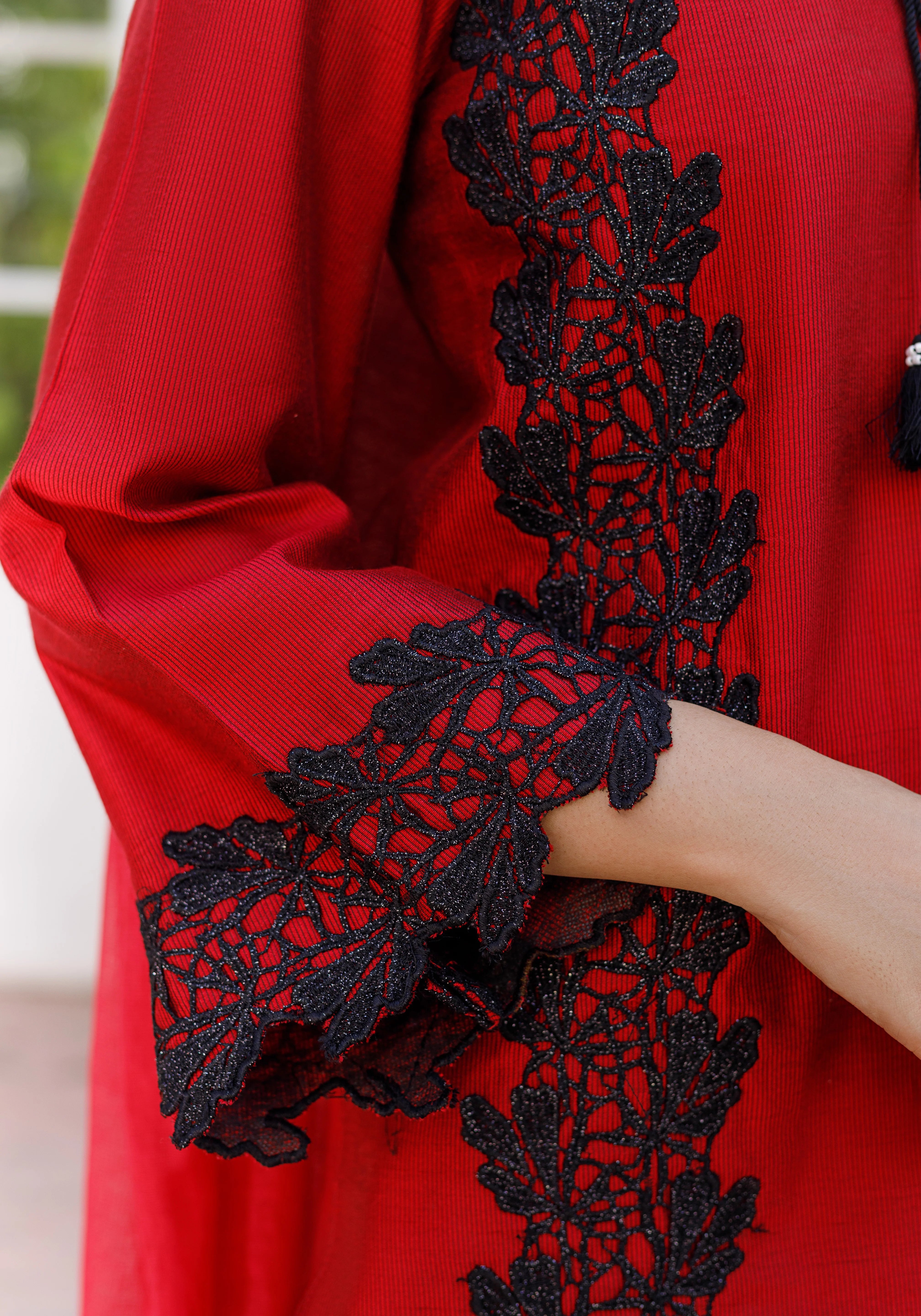 Shirt:- Khaddi Silk Fabric with embroidered patch and Handmade Neck tassels.