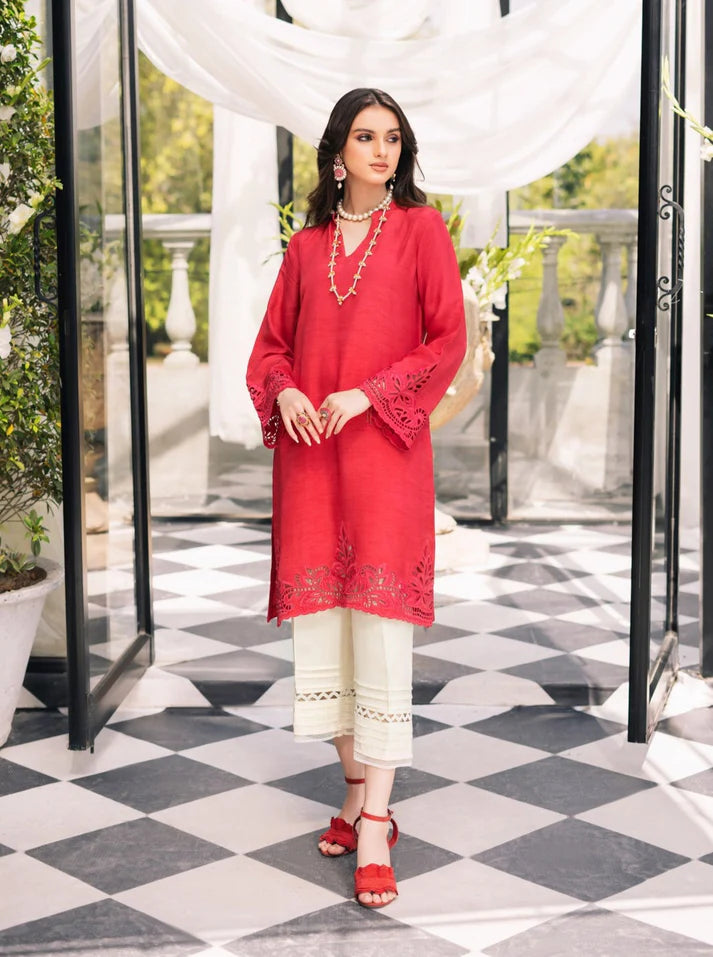 Savannah is a hot pink bombshell paired up with subtle cream bottoms. The two colours put together impeccably balance each other’s essence and put forward a stunning ensemble. The outfit encloses a Korean silk shirt with carefully crafted cutworks on sleeves and daman and lace applique cullotes bottom