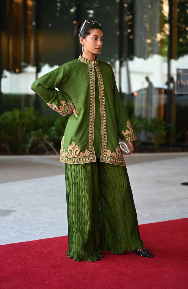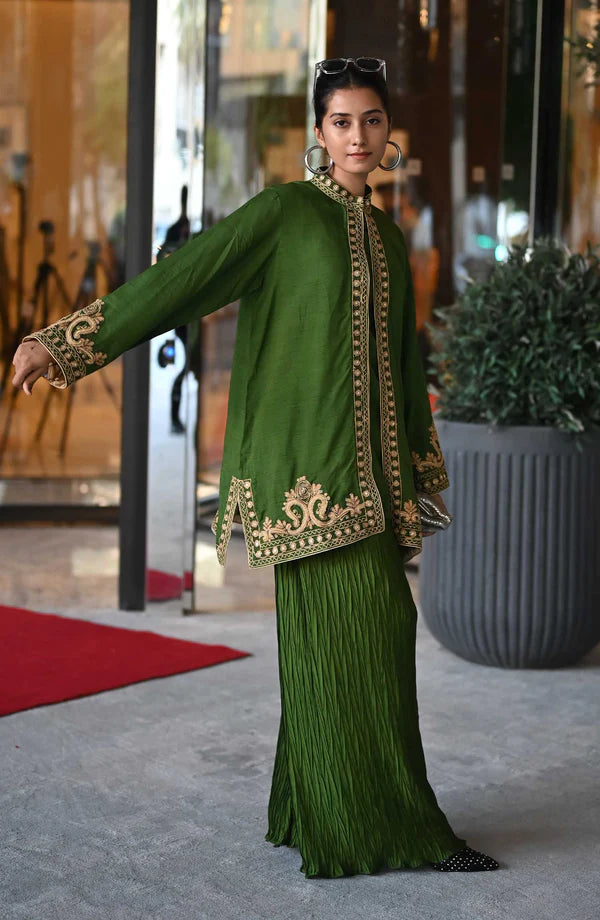 Cutline : The Ensemble makes a Splendid Look. A front open Short Medium Length jacket with Under shirt and Crush Silk Palazzo.