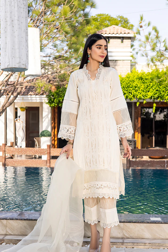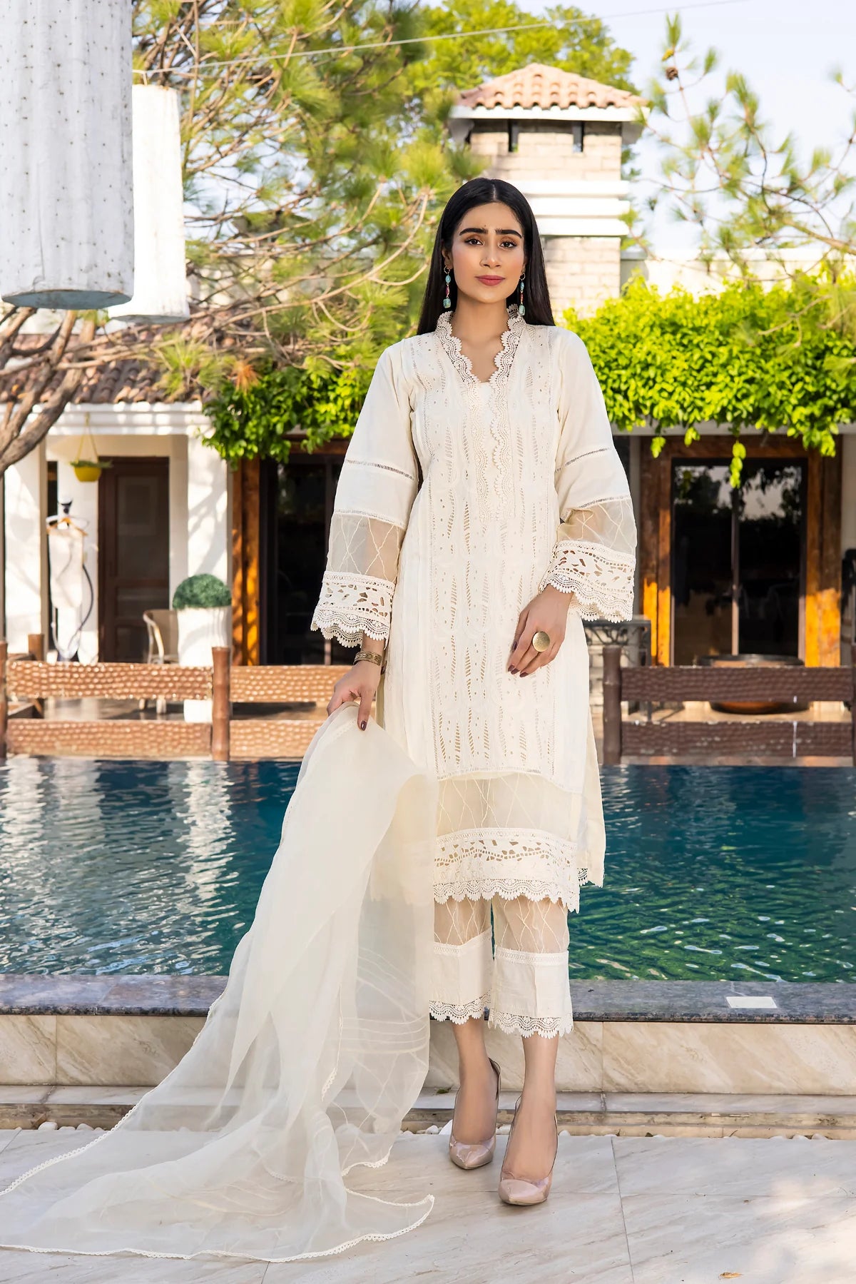 This monotone ivory Chicken and lawn attire is a visible exhibition of class that you can carry around in any formal or informal event. The outfit encloses a chicken materialized center panel and pleat detailed side panels delivering an essence of trendy art along with laced neckline Patti. The extravagantly crafted with detail Daman and sleeves flaunt pleated organza Patti, lacework, and chicken borders. The shirt comes with matching colored culottes pleated with organza Patti and lace on borders. The dupatta garnished with lacework and pleats on the edges can be added separately.