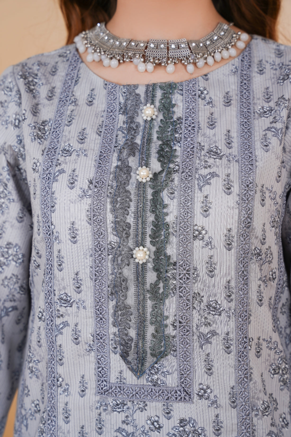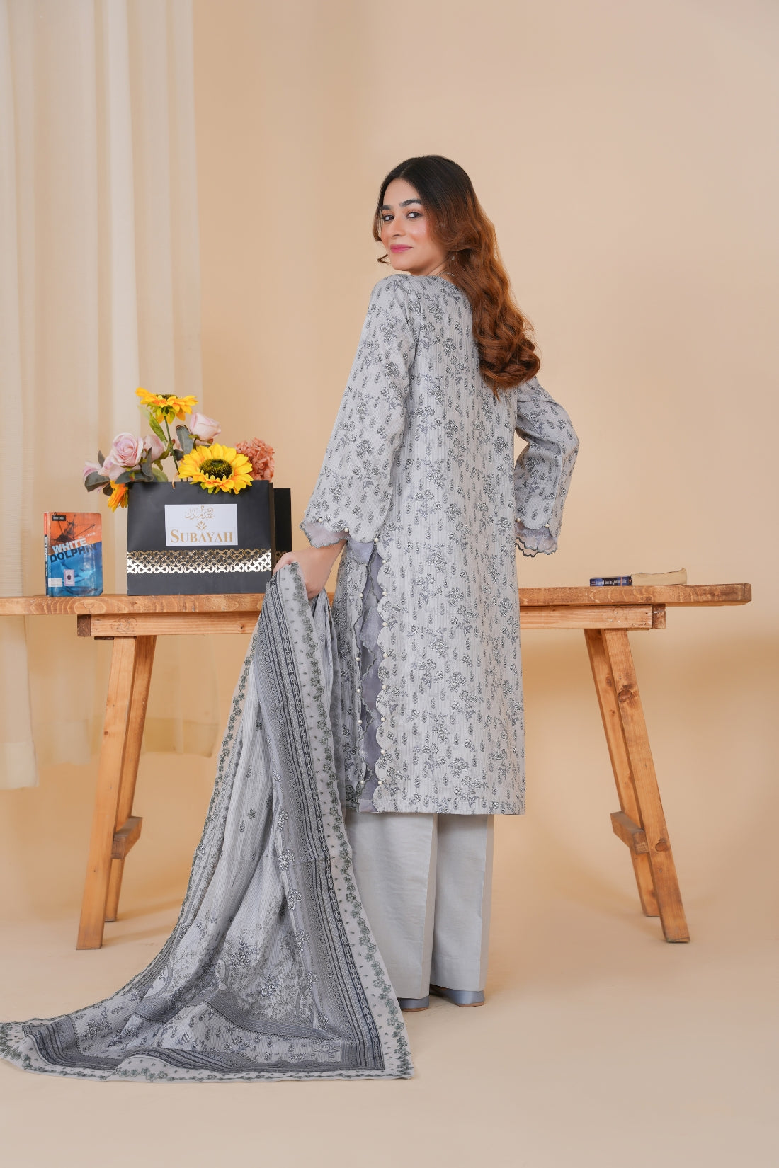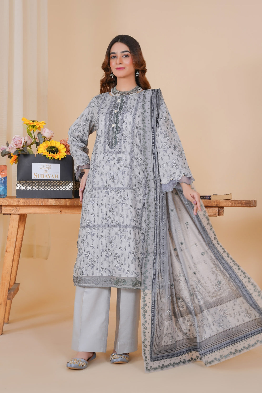 This elegant three-piece printed lawn suit is designed for both style and comfort. The ensemble includes: