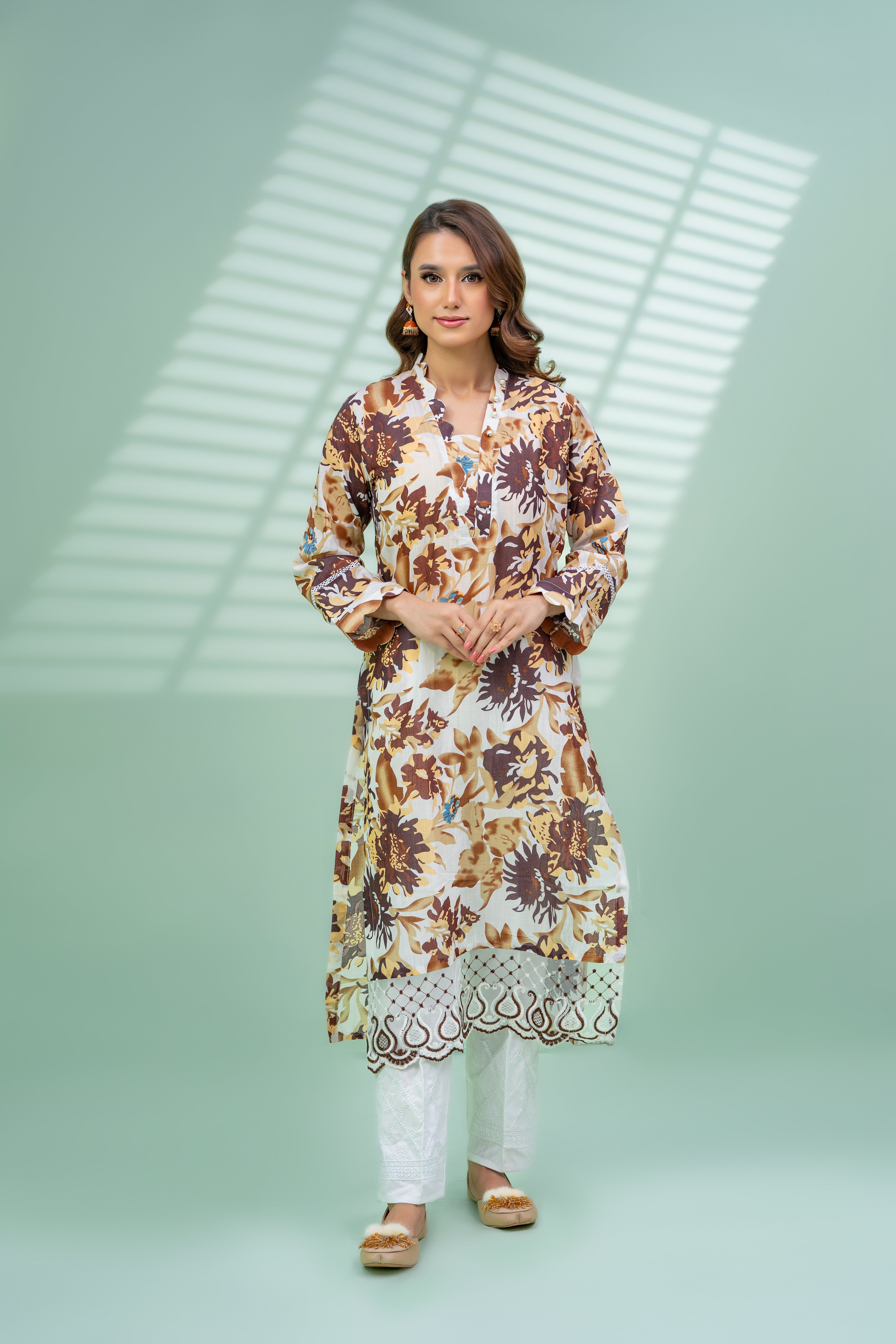 - A sleek, straight-cut long kurti that drapes gracefully to the ankles, offering a modest yet stylish silhouette. The Chinese collar adds a contemporary touch, giving the outfit an understated but refined look.