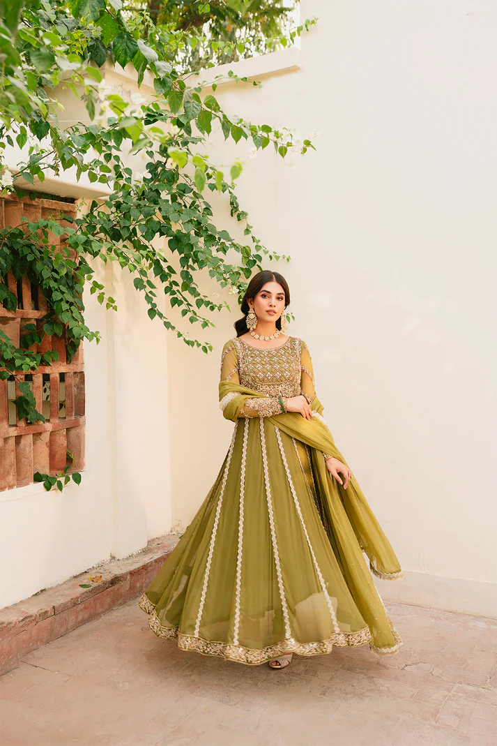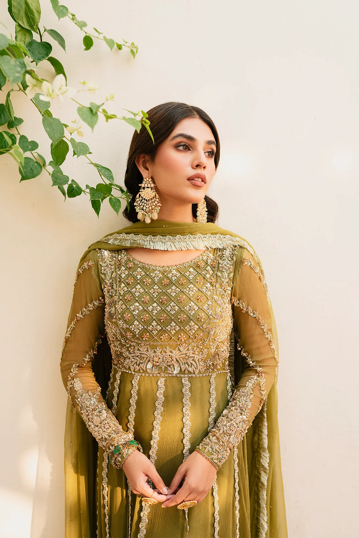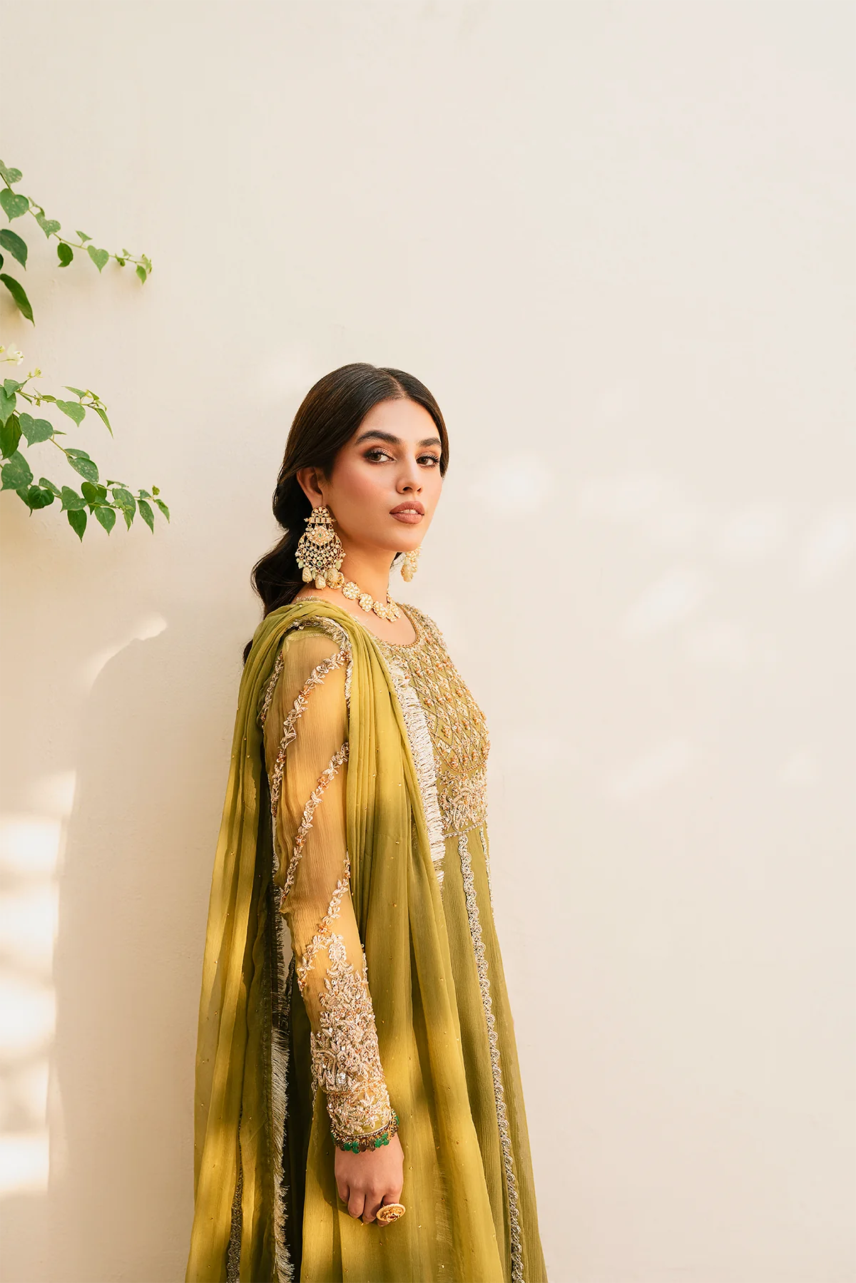 The beatific beauty of bamboo green is exhibited through Kalidar Peshwas heavily embellished and embroidered with Naqshi Dabka details, Champagne crystals, Tilla Zari fragments, and Sitara & Moti work in hues of dull gold on the bodice and fitted sleeves. The front body also reveals Gota-laced panels and handcrafted borders.