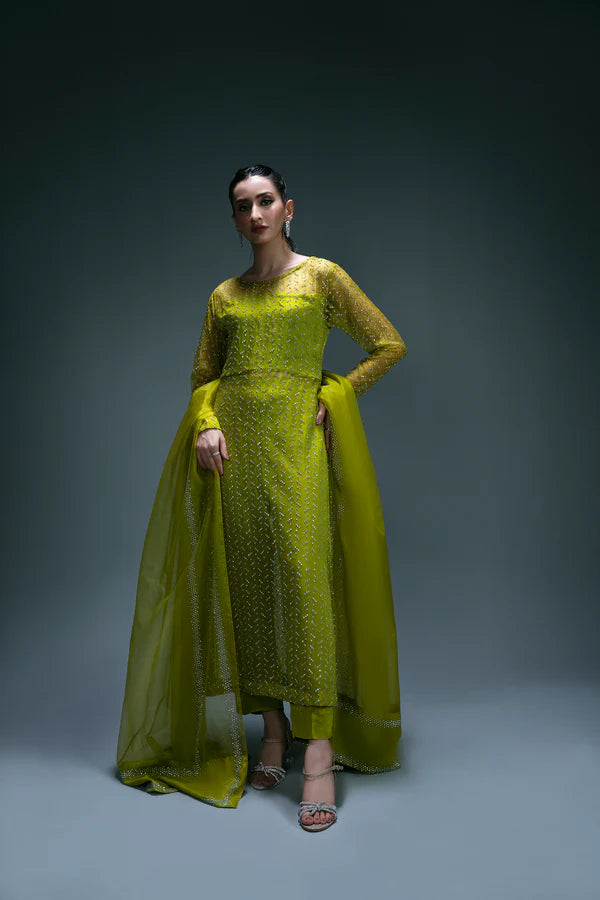 An elegant three-piece ensemble in apple green, featuring a pure organza long shirt with a side slit, embellished with silver rhinestones in a geometric pattern. The shirt comes with a pure tassel silk off-shoulder slip that ends at the waist for a modern touch. It is paired with straight-cut trousers made from pure tassel silk and a pure organza dupatta with rhinestone borders for added sophistication.