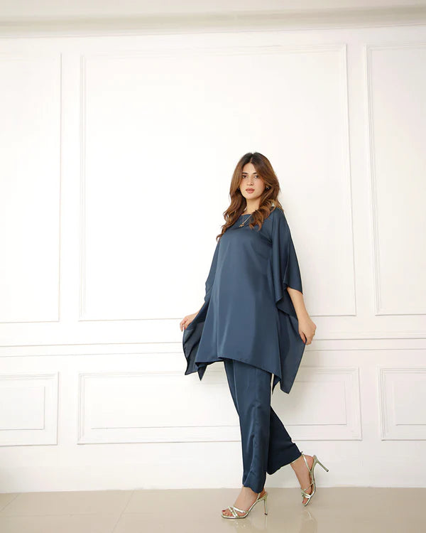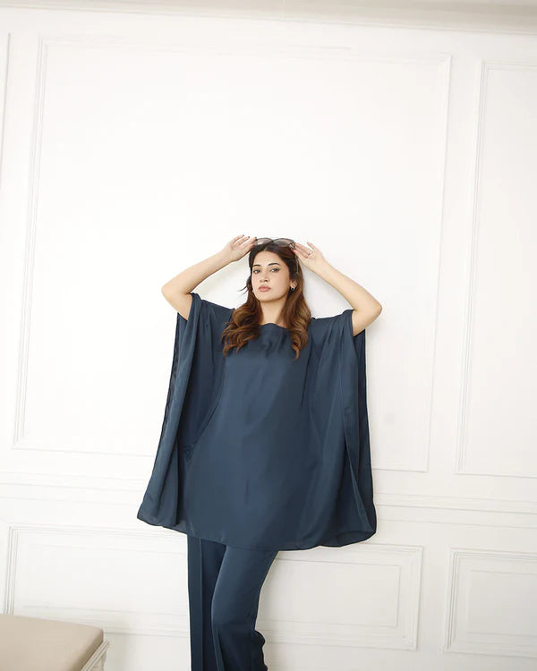 A pure georgette short square kaftan in a vibrant sea teal shade, paired with slightly loose pants for a comfortable yet stylish casual look. The flowy fabric of the kaftan offers ease of movement, making it perfect for effortless style with a refreshing pop of color.