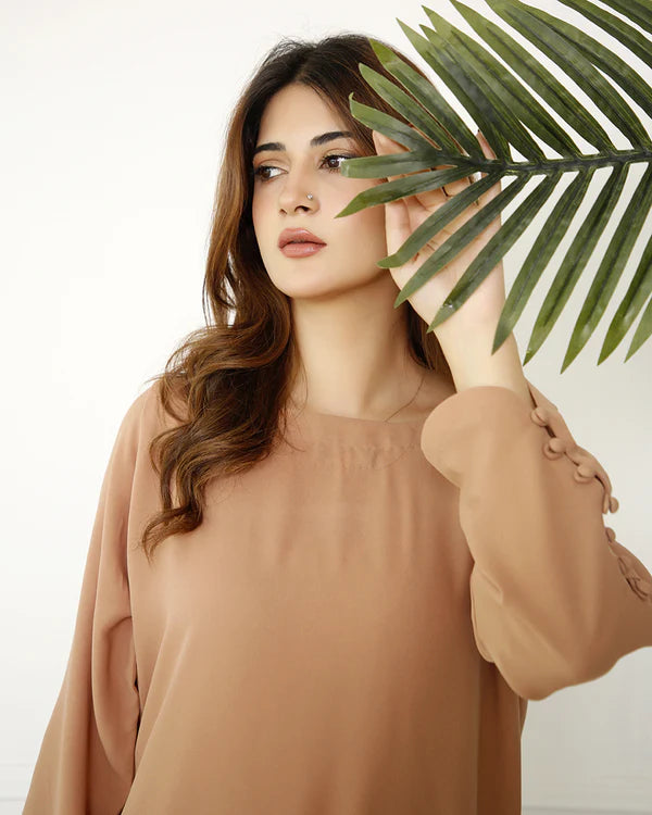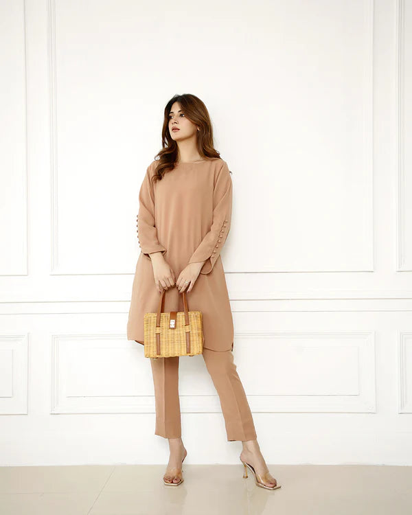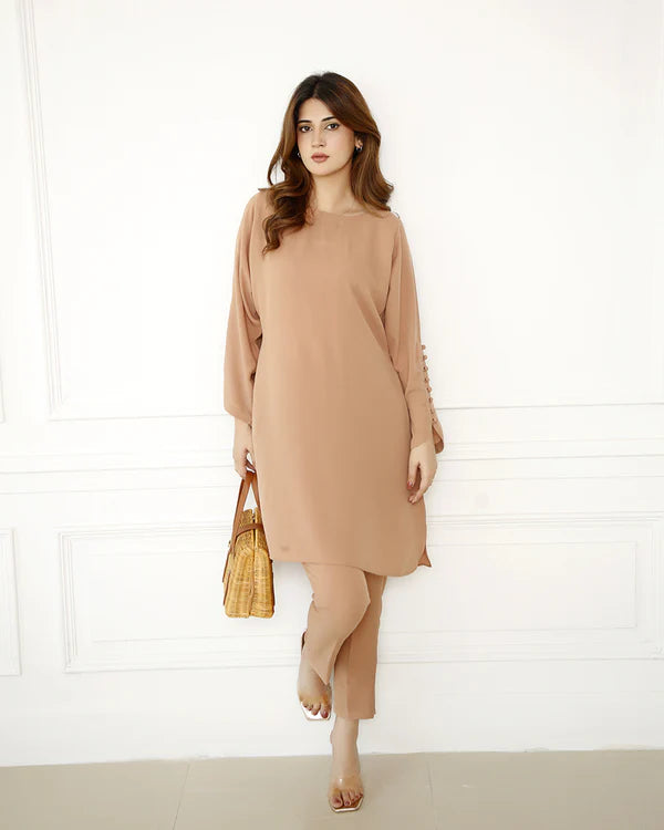 A skin-colored short shirt made from pure georgette, featuring side V-slits and a rounded hem for a sleek look. The sleeves are accented with button loop detailing, adding a touch of elegance. Paired with straight pants, this outfit offers a simple yet sophisticated style, perfect for both casual and semi-formal occasions.