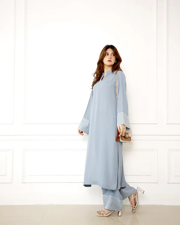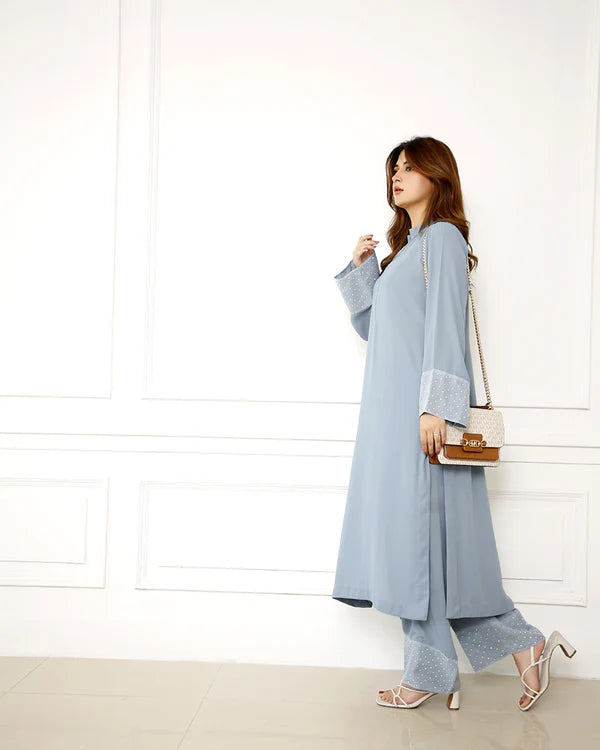 An ice blue long shirt made from pure georgette, featuring a ban collar and button placket adorned with rhinestones for a touch of elegance. Paired with light palazzo-style pants, the outfit is further enhanced by organza patches on the sleeves and pant bottoms, beautifully embellished with a rhinestone spray. This ensemble is perfect for festive occasions or evening gatherings, blending comfort with a glamorous sparkle.