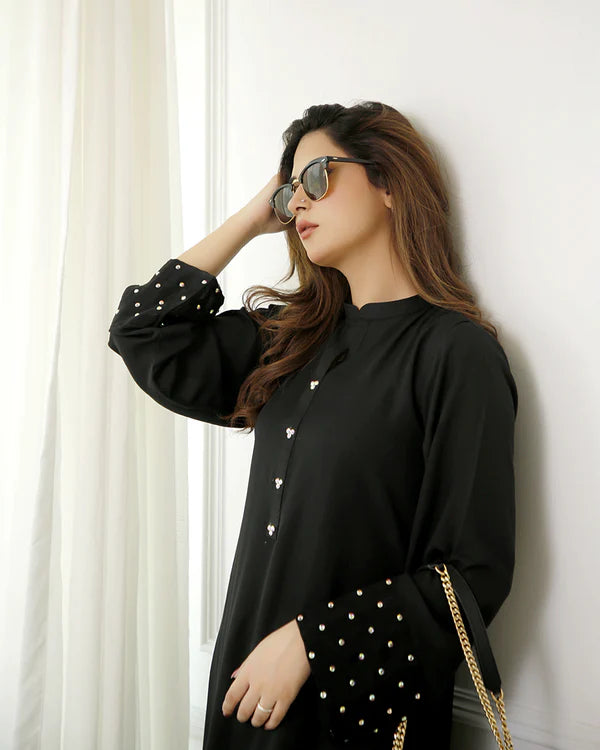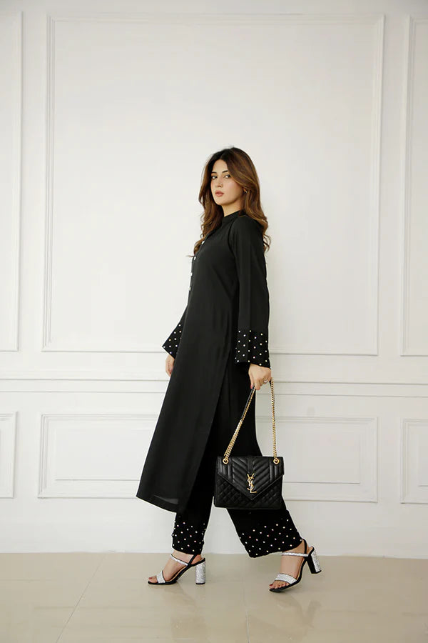 A pure georgette long black shirt with a ban collar and button placket adorned with rhinestones for a subtle sparkle. Paired with light palazzo-style pants, the outfit is elevated with organza patches on the sleeves and pant bottoms, embellished with a spray of rhinestones. This elegant ensemble is perfect for festive occasions or evening gatherings, offering a blend of comfort and glamour.