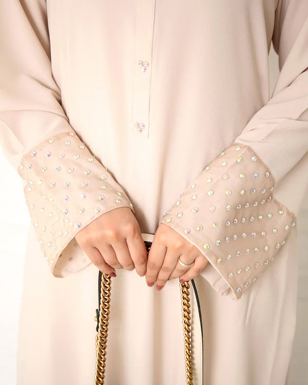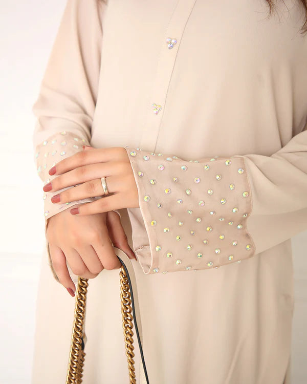 A pure georgette long beige shirt featuring a ban collar and button placket adorned with rhinestones for a refined sparkle. Paired with light palazzo-style pants, the outfit is enhanced with organza patches on the sleeves and pant bottoms, embellished with a spray of rhinestones for a touch of elegance. Perfect for festive occasions or evening gatherings, this ensemble combines comfort with subtle glamour.