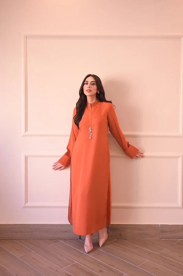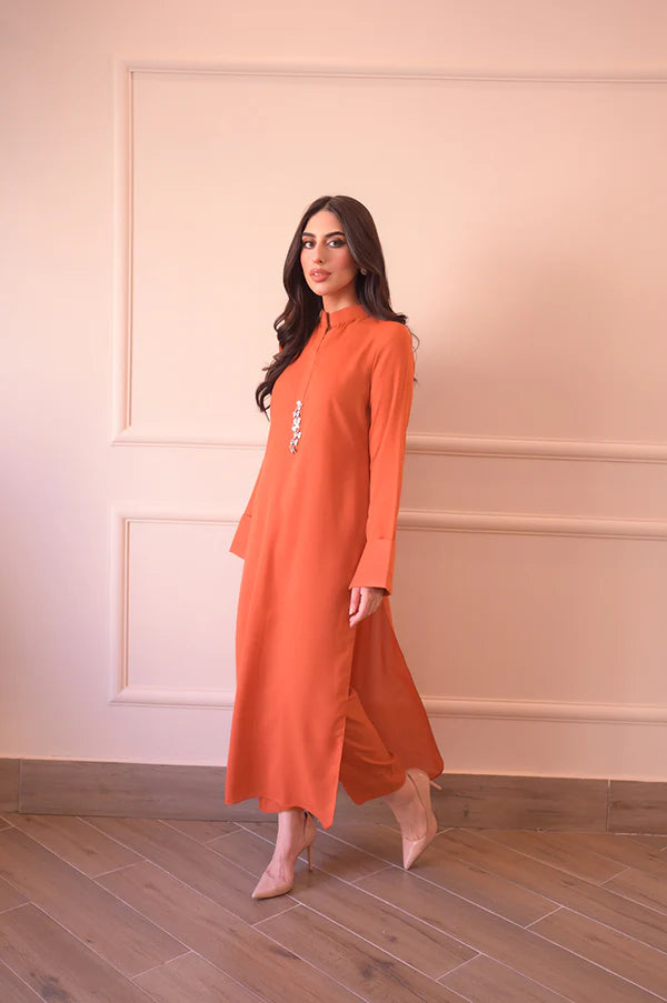 A pure Korean coral orange georgette suit with a modern, casual style. The shirt features a slightly rounded hem with a ban collar placket adorned with asymmetrical metallic buttons and a subtle pearl touch. The sleeves have folded cuffs with small slits, adding a stylish detail. Paired with straight pants, this outfit offers a smart and chic look.