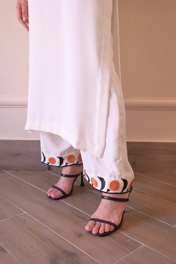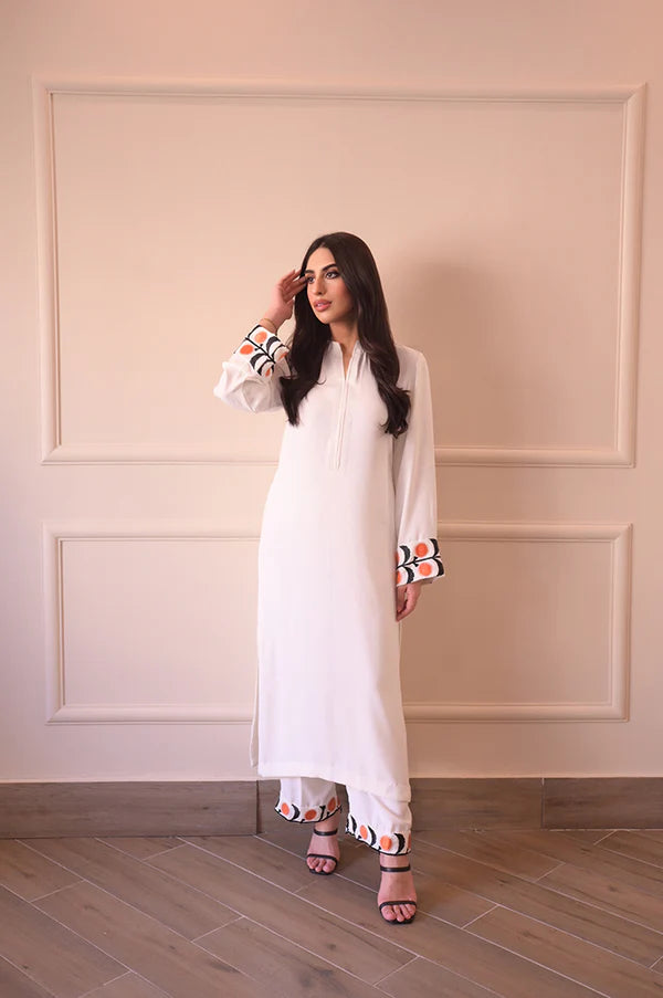 A pure Korean white georgette co-ord set featuring elegant patches on the sleeves and trouser bottoms with intricate machine work. This detailing adds sophistication and a refined look to the outfit, making it perfect for any occasion.