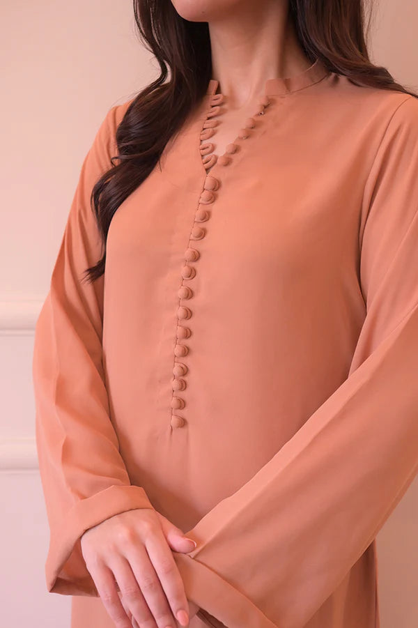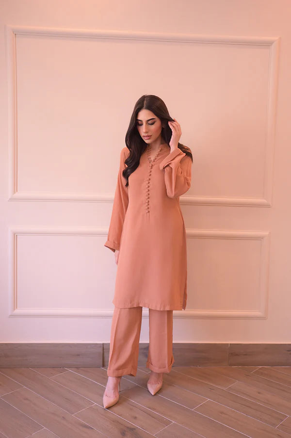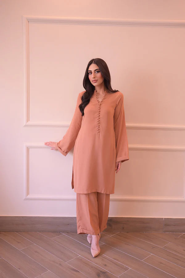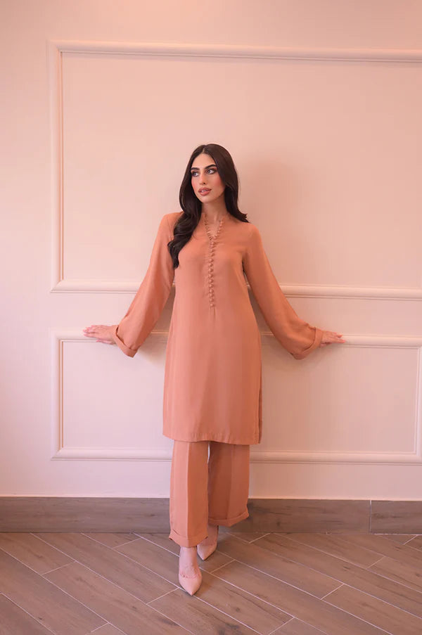 A skin peach-colored pure georgette co-ord set featuring a ban collar and front buttons. The shirt has a loose, comfortable fit, paired with relaxed, loose pants. Both the pant bottoms and sleeves feature folded patch details, adding a subtle, chic touch to this effortlessly stylish outfit.