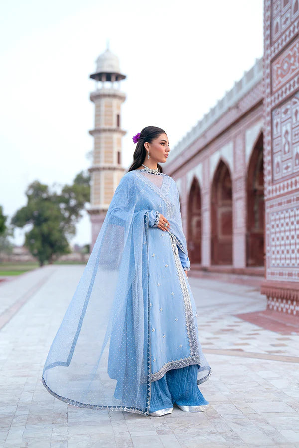 A breathtaking ode to timeless elegance, this pastel sky-blue ensemble from the Noor-e-Jahan Collection embodies regal sophistication with a modern grace. 🌸