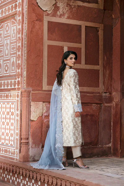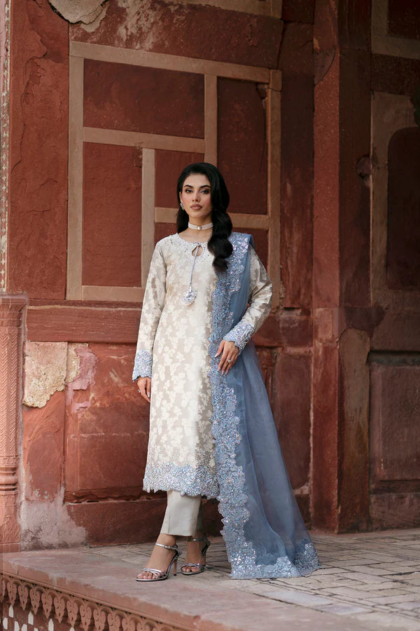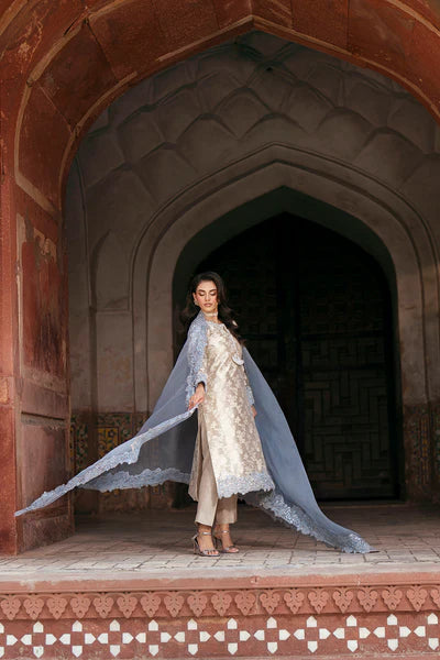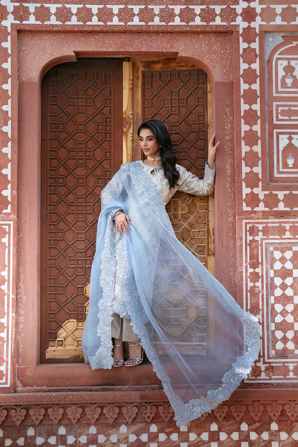 Paired with silk trousers and a contrasting pure organza dupatta, the outfit achieves the perfect harmony of subtlety and grandeur. The dupatta, adorned with a heavily embellished border, flows with regal grace — becoming the statement feature that ties the entire look together.