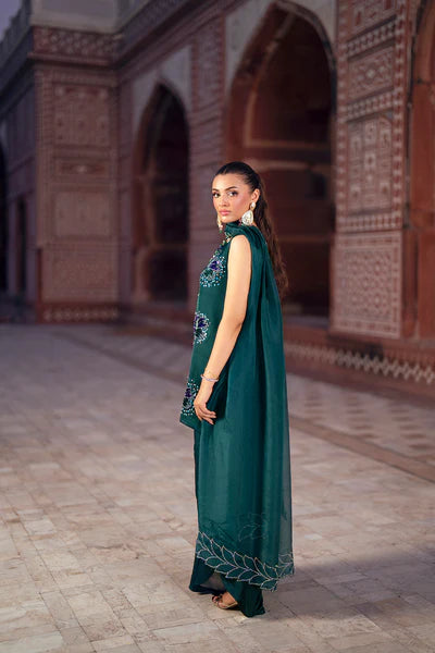 This elegant bottle green outfit is a timeless statement of sophistication and festive charm. ✨ The short shirt is crafted from luxurious pure Rayyan silk, intricately embellished with delicate rhinestone and sequin work that adds a subtle shimmer with every movement. Its refined detailing enhances the richness of the deep green tone, creating a graceful festive allure.