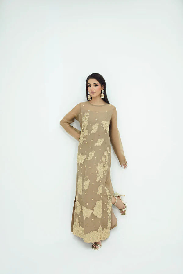 Designed with full sleeves and a classic round neckline, the kaftan maintains a modest yet refined appeal. The true highlight lies in the golden applique hand-embellishment, intricately adorned with sequins, beads, and threadwork in floral and leafy motifs. The embellishment is asymmetrically placed, cascading from the neckline down to the hemline, adding both depth and an elongated slimming effect.