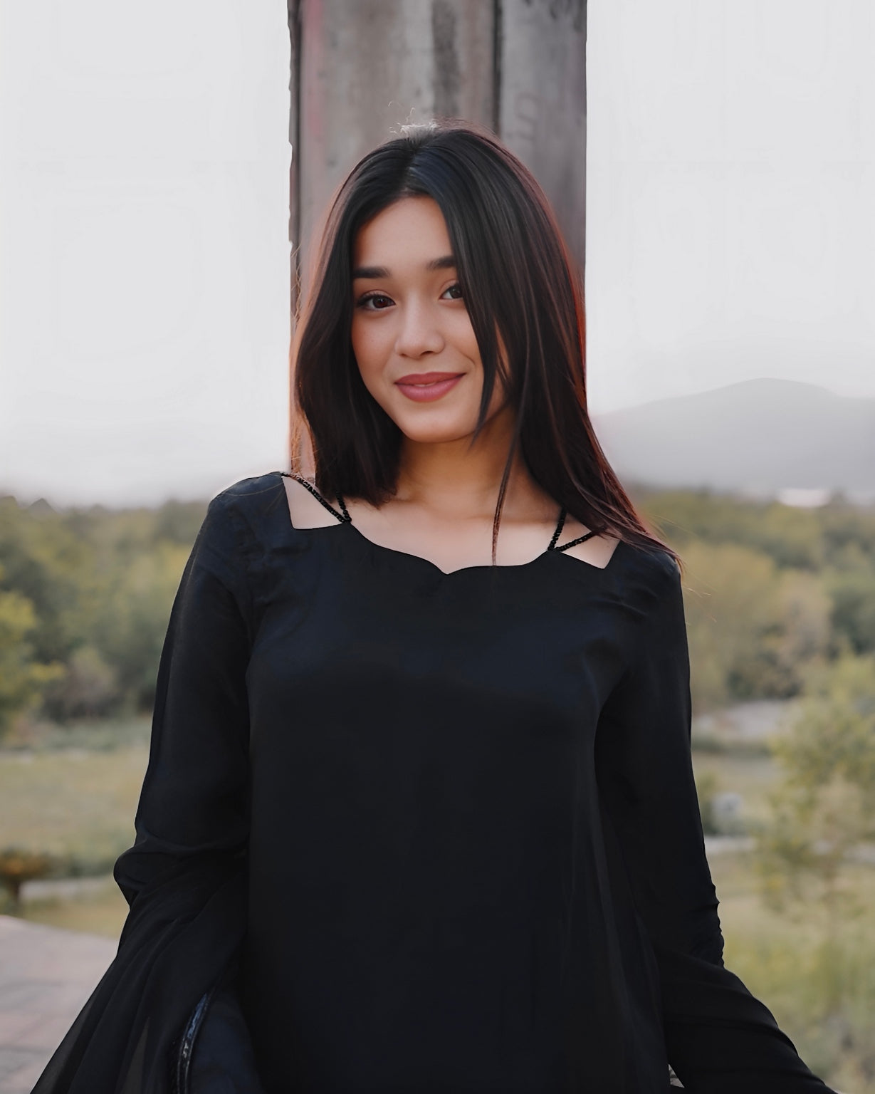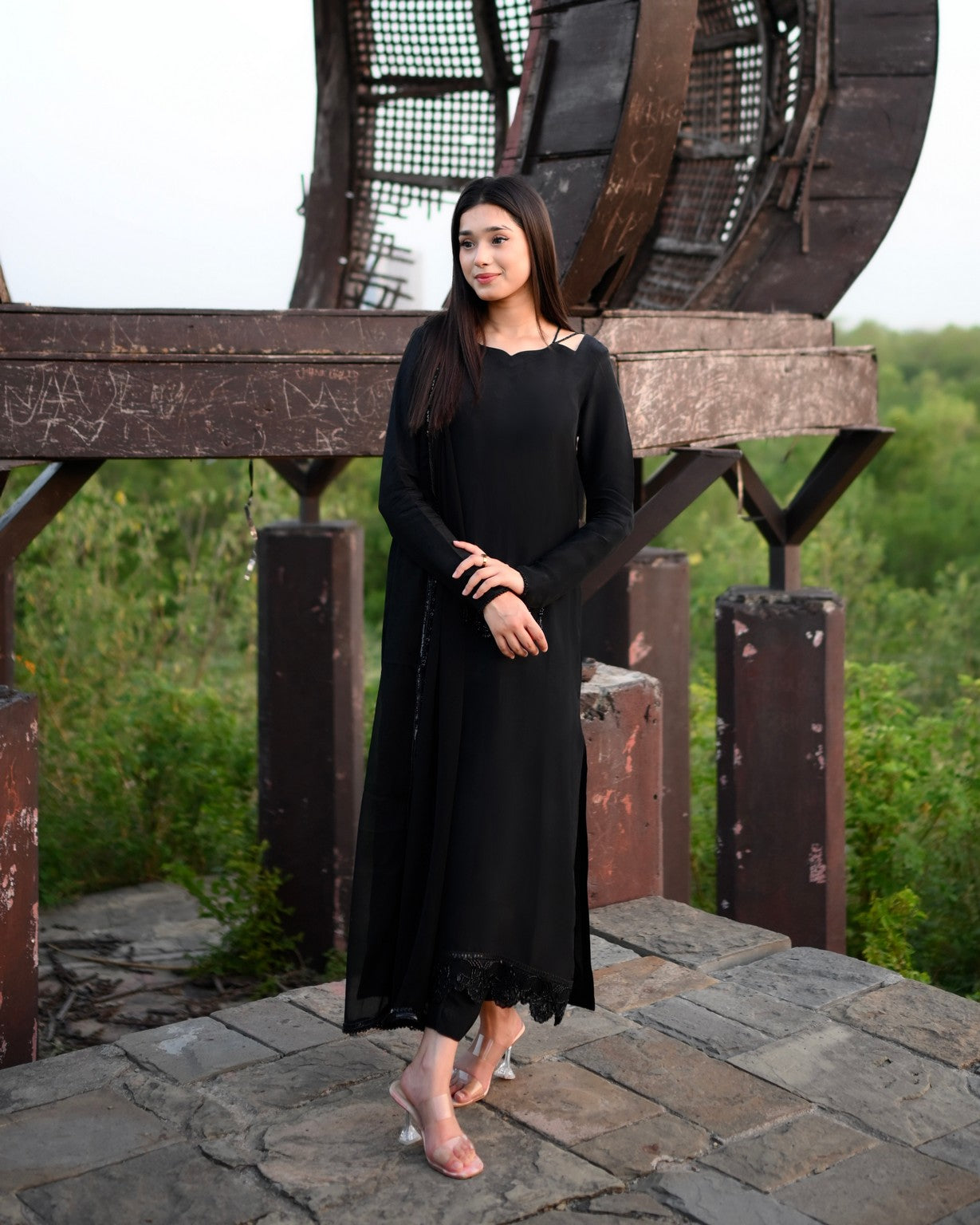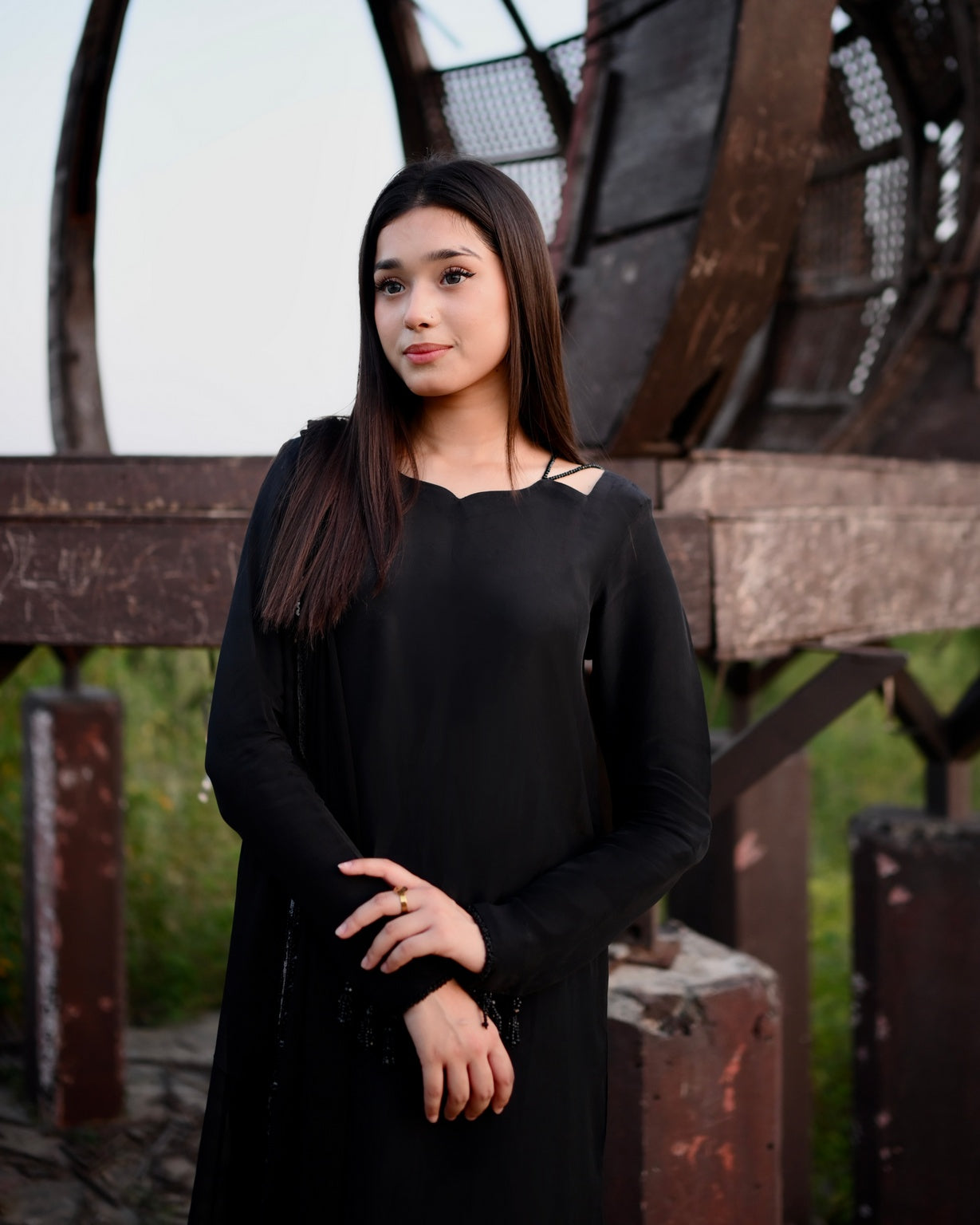 - ‘Shab’ is crafted on Russian silk with a uniquely designed crystal-moti neckline. Sleeves feature delicate tussels and black moti lace, while the cut dana border adds a luxurious finish. The long shirt silhouette exudes elegance and enhances the overall grace of the outfit.
