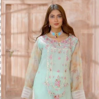 Experience the magic of our “Sky Blossom” dress, a captivating fusion of powder blue hues that evoke feelings of serenity and calm. This maxi showcases stunning foil thread work on the front and sleeves, complemented by intricate handmade adda work. The maroon heavy embroidered dupatta, adorned with an embellished bottom on the trouser, adds a contrasting yet harmonious touch to this enchanting ensemble.
