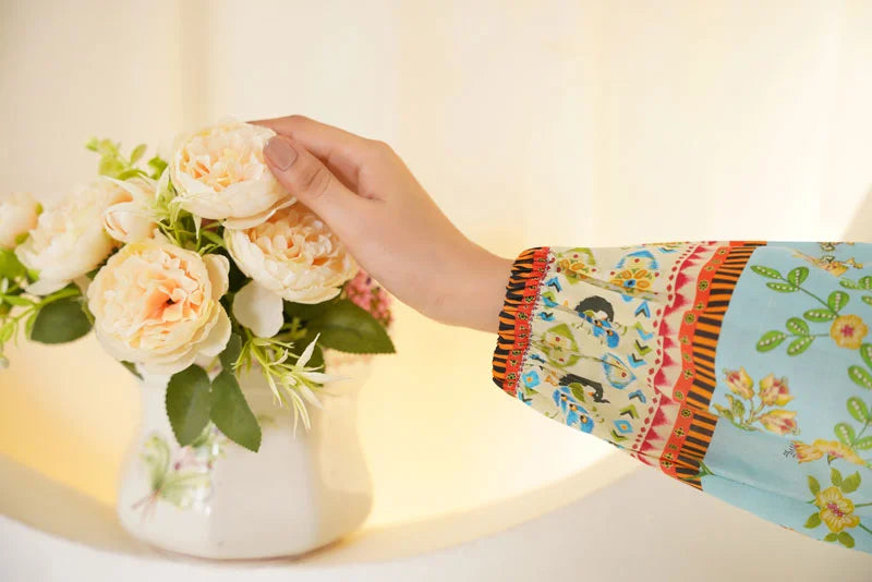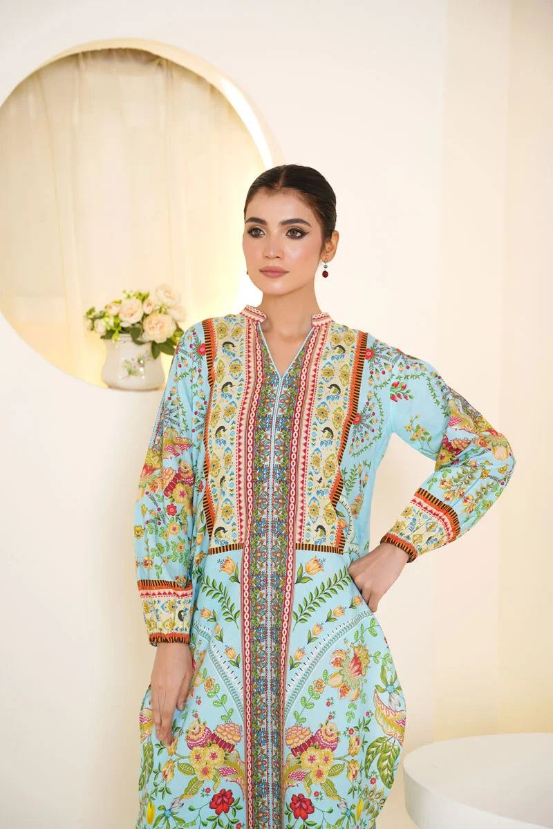 Description Shirt: Soft lawn kameez in a blue base with multicolored floral print, designed for a fresh...