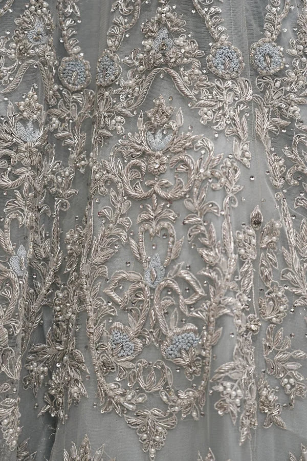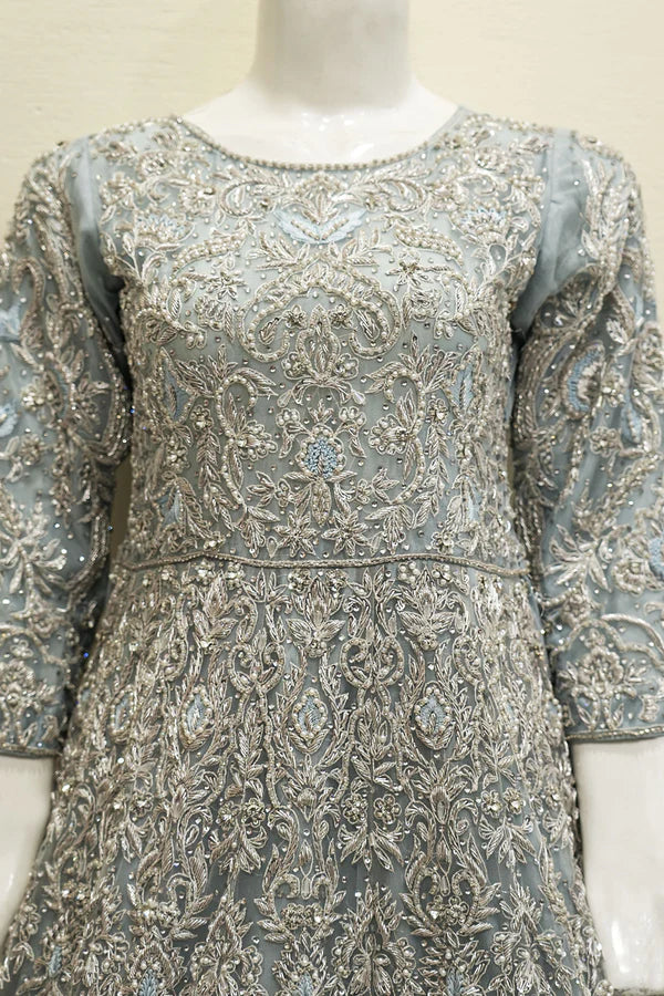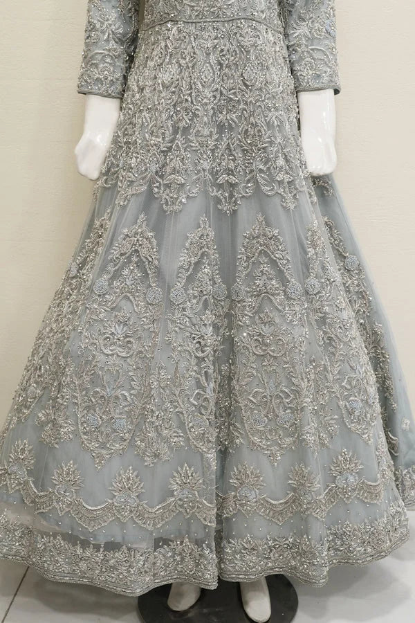 Introducing the ethereal “Sky Serenity Bridal Maxi” from Designer Bridals by MJ by Madiha Jahangir, an epitome of grace and sophistication. This enchanting ensemble is perfect for bridal receptions, featuring a sky blue long maxi shirt adorned with intricate silver qoora, dabka, silver stones, white pearls, white crystals, and Resham embroidery. Crafted with meticulous attention to detail, this two-piece ensemble comprises a full-length maxi and a fully adorned dupatta, exuding elegance and charm. Embrace the serenity of the sky and radiate timeless beauty on your special day with this exquisite bridal attire.