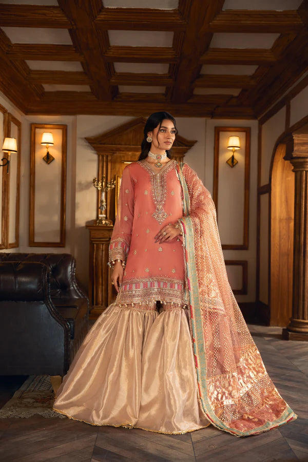 A coral-peach organza hand-embellished shirt paired with a golden tissue gharara and a net screen-printed and organza jacquard dupatta is a truly exquisite and elegant ensemble, perfect for special occasions.