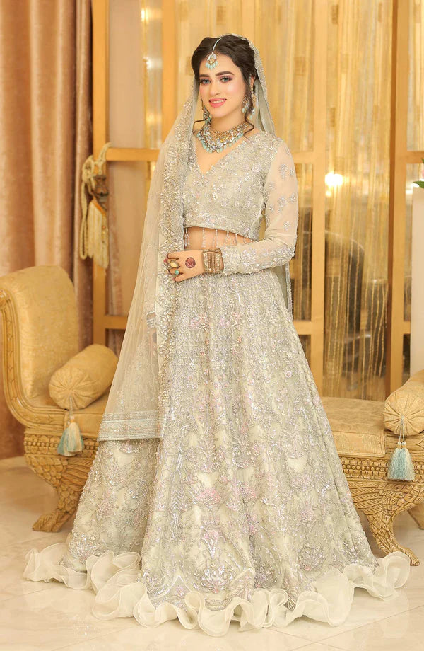 A Beautiful Organza Lehnga And Choli is Hand-Crafted with Crystals, Pearls, Sitara and Semi-precious Stones. It is Paired up with a Grey net Dupatta that is Framed with a 4 side Border of Pearls, Sitara and Crystals.