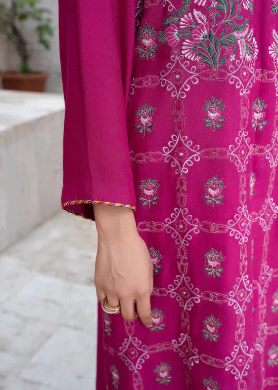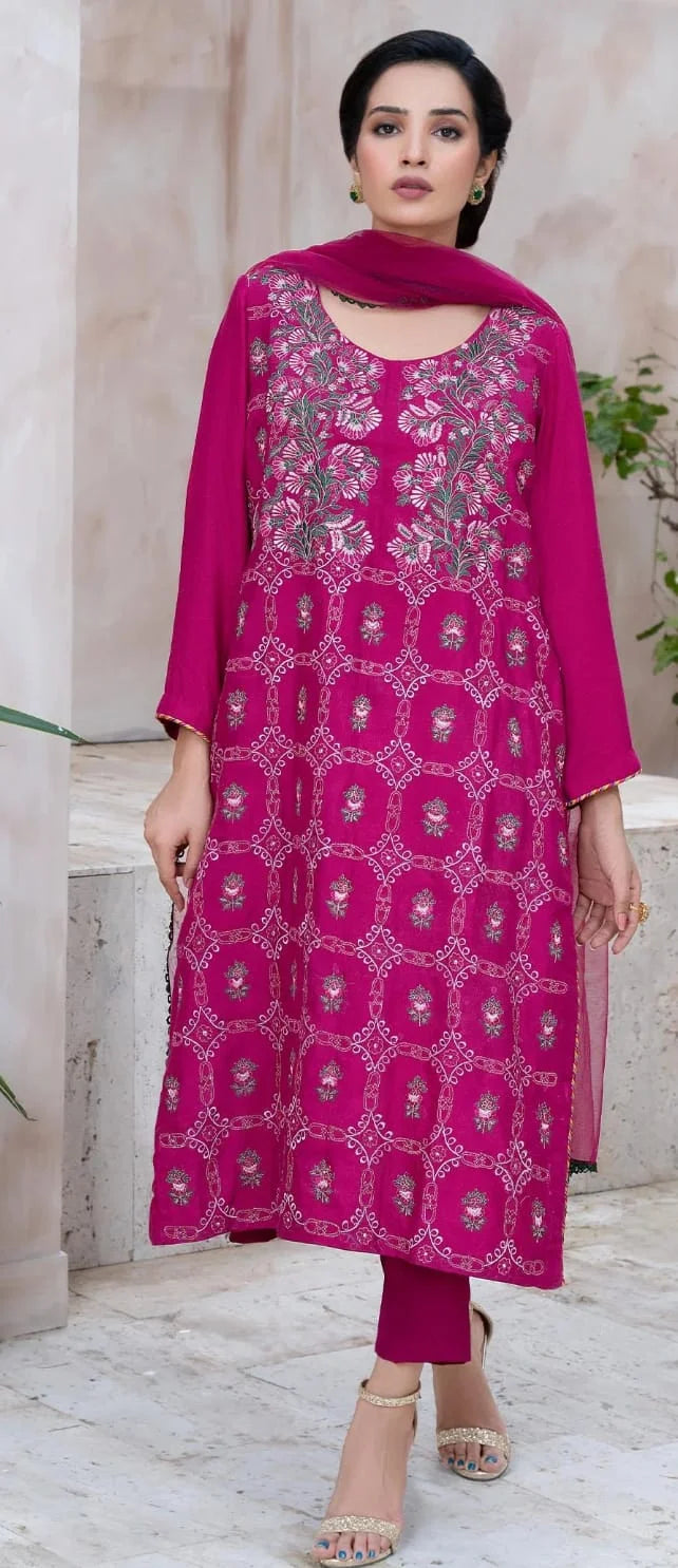 Description: A rhapsody of fuchsia Color intricate with geometric embroidery threadwork design to make the ensemble more classic with Dopatta and Rawsilk Pants.