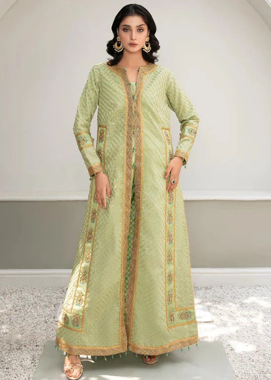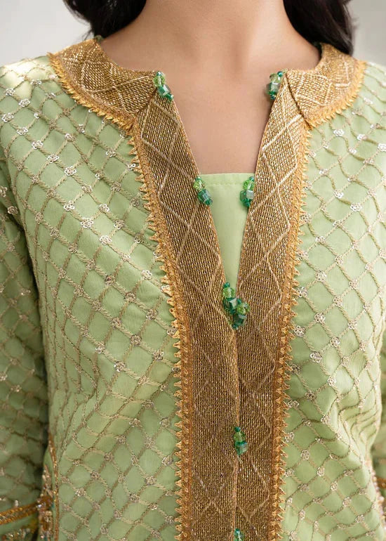 Description: Indulge in the lavish RANG-E-MERAAS apple green formal gown. It’s a long front open creation adorned with Gold borders and light and dark green crystals. Paired with under shirt and pants, The gown’s delicate adda work pays homage to the unmatched art of Hand Work.