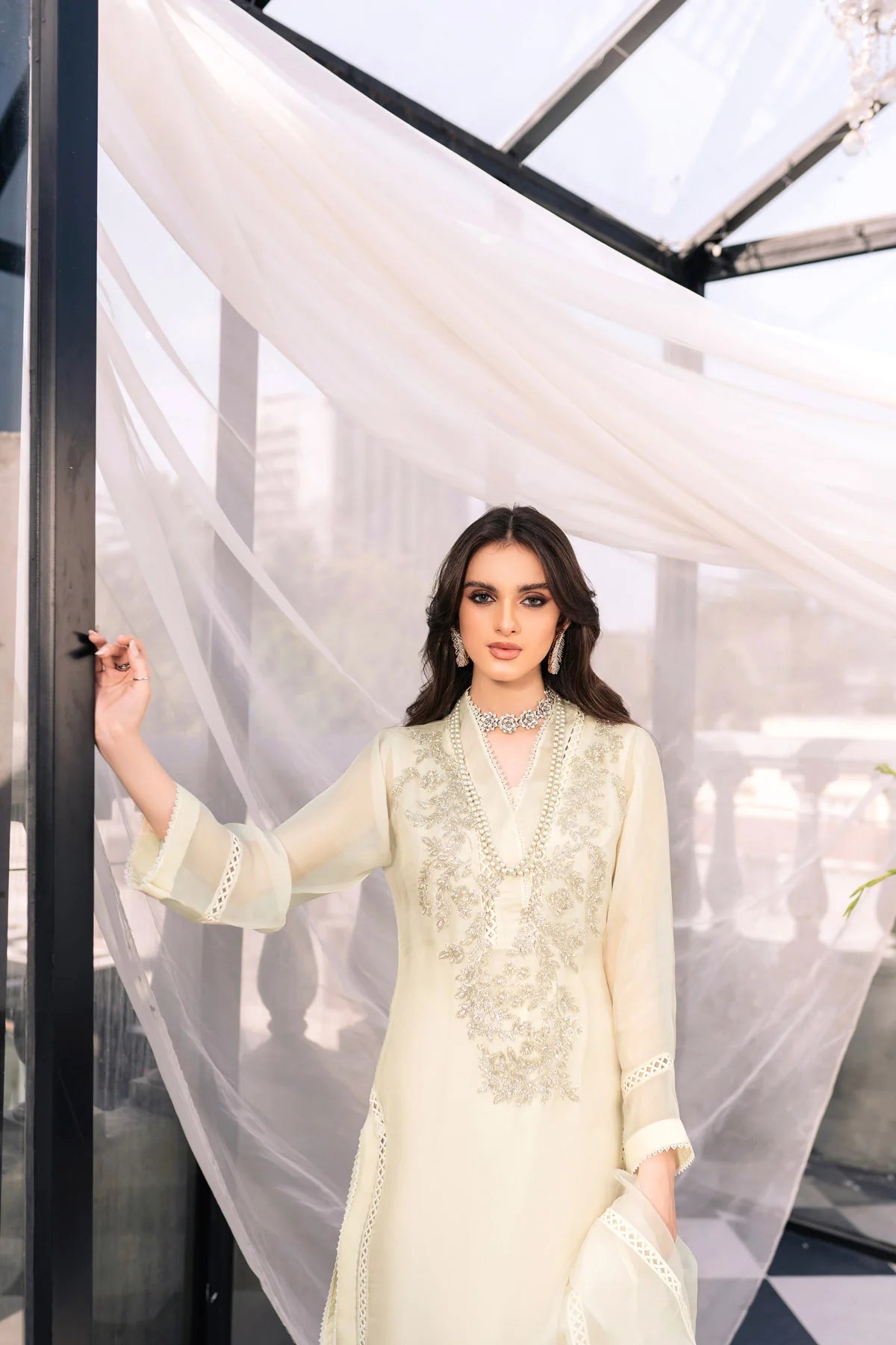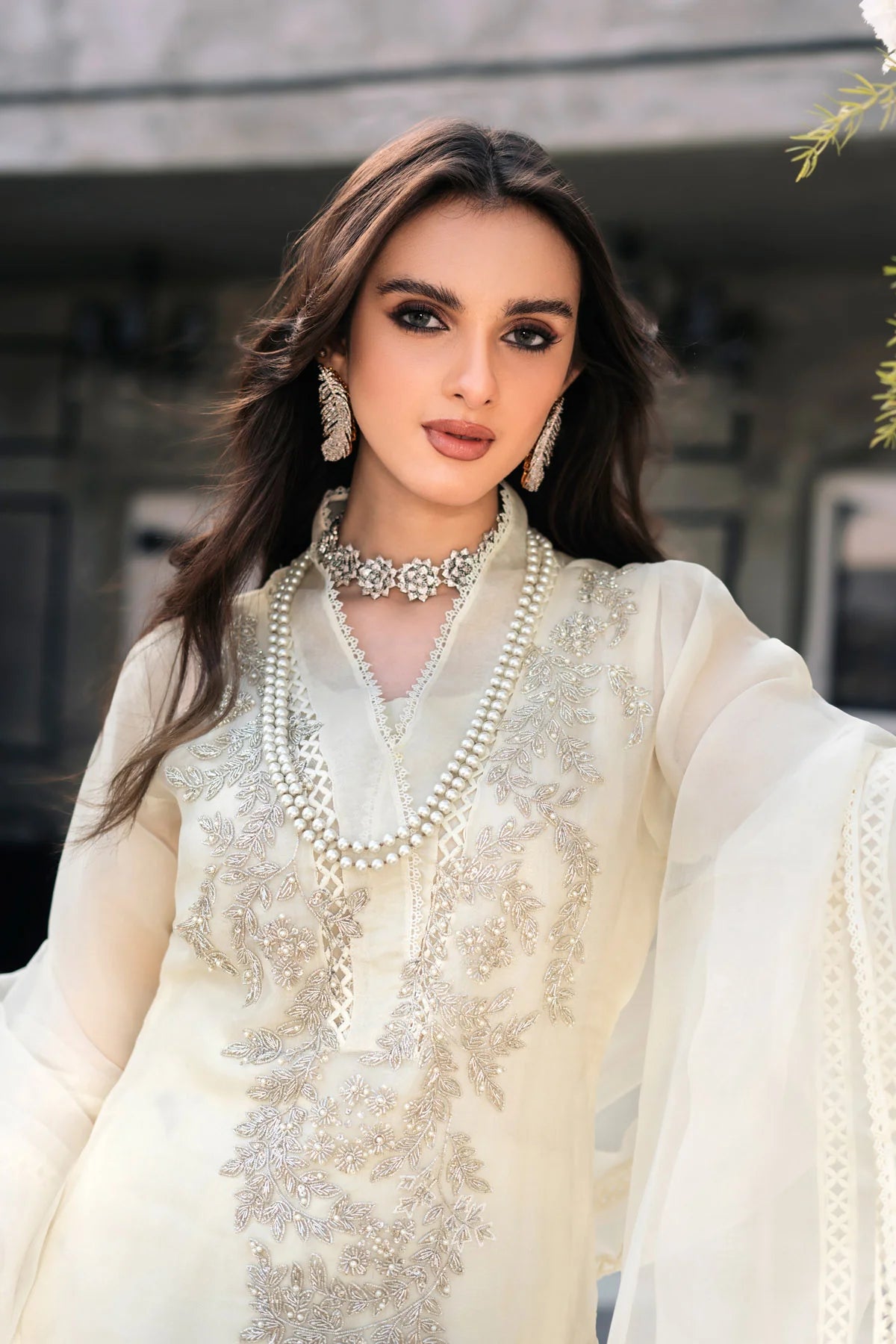 This Sylvie outfit presents a ravishing pure organza shirt with lace neck line smothered in Ari and naqsha work with beads and pearls. The laced borders display an exquisite sense of style. It comes with a bottom of Korean silk pants, organza dupatta lined with lace work and a slip that follows separately.