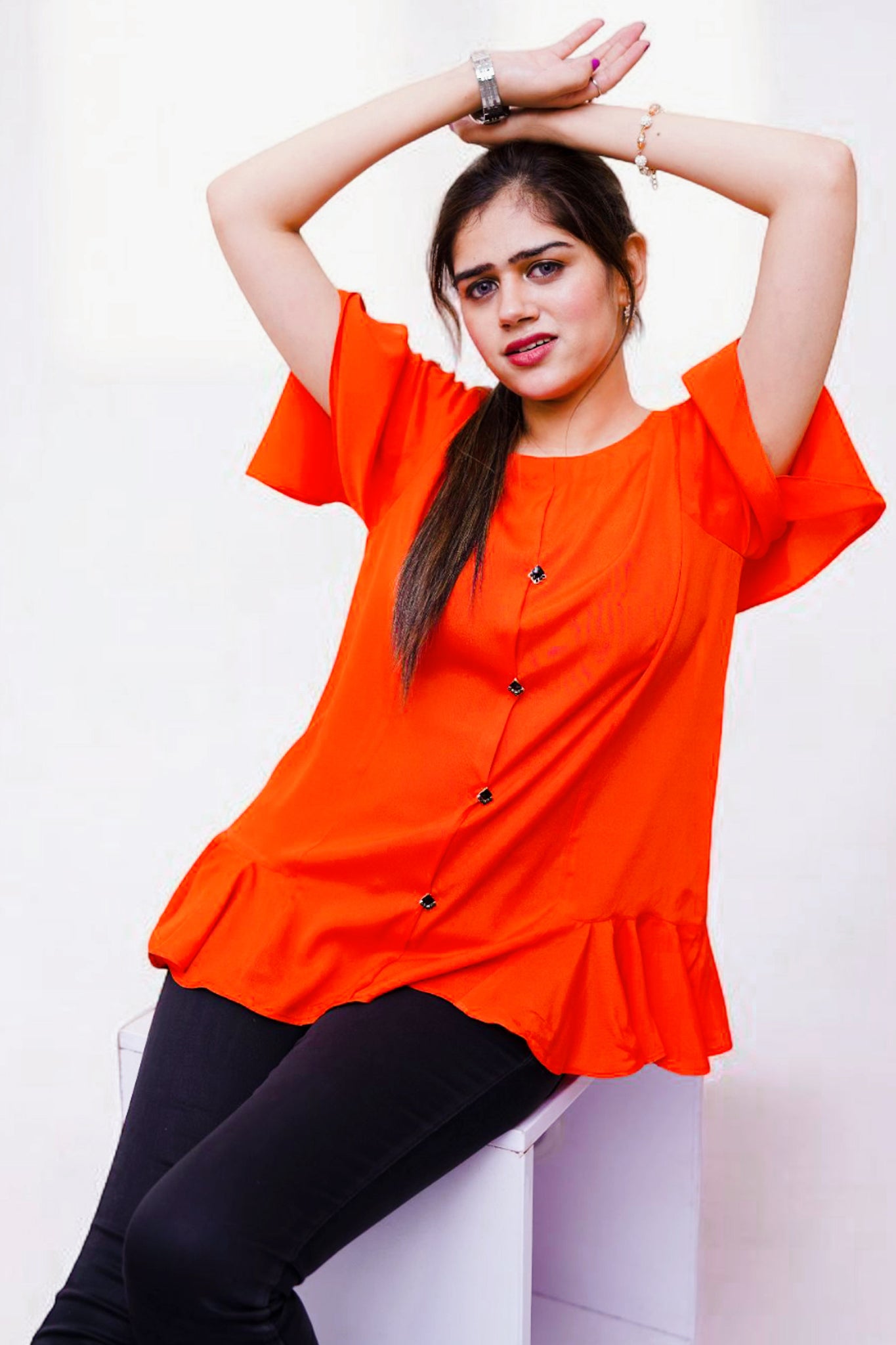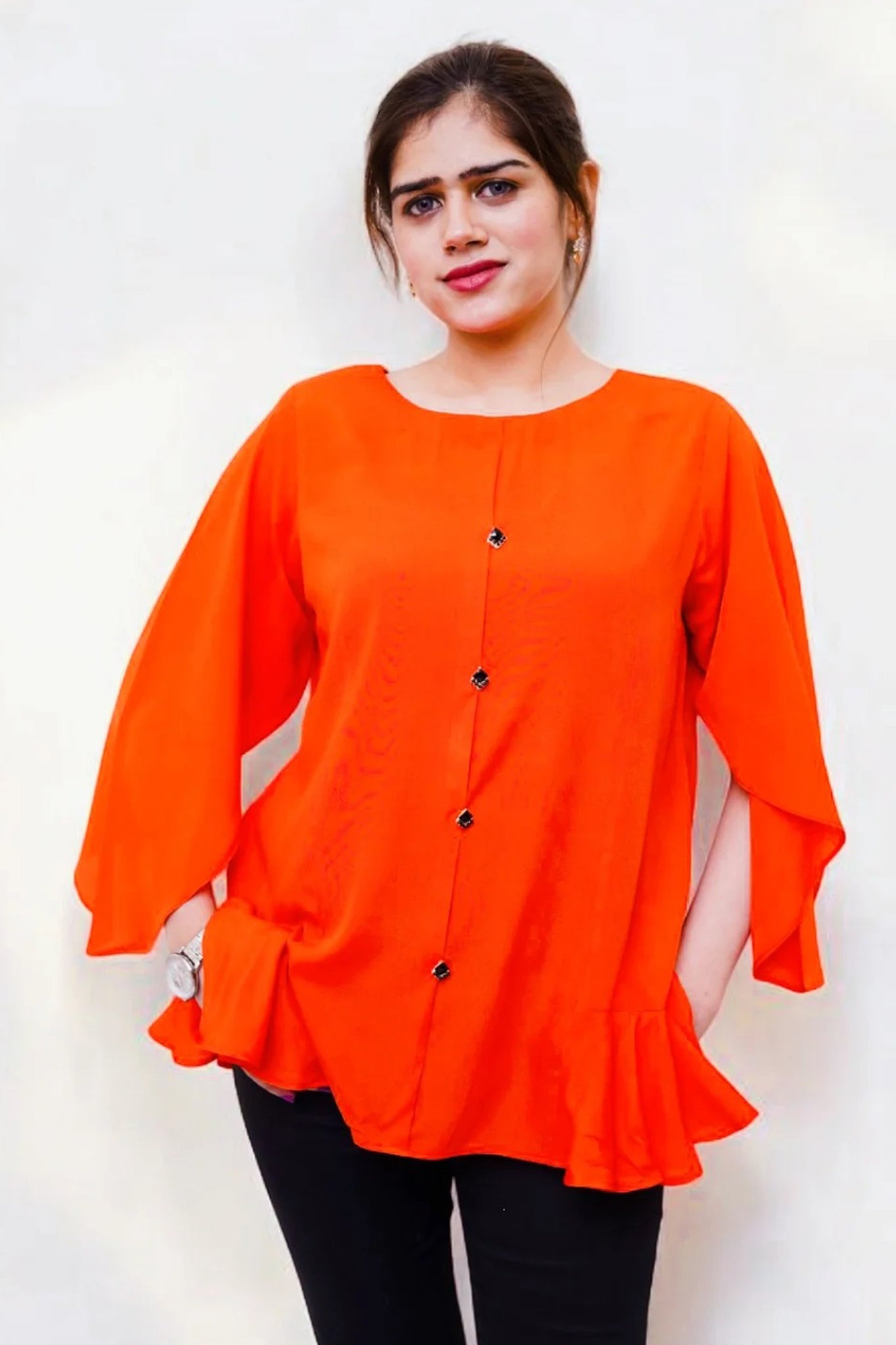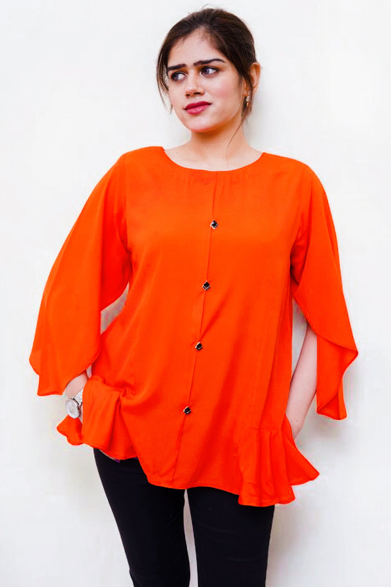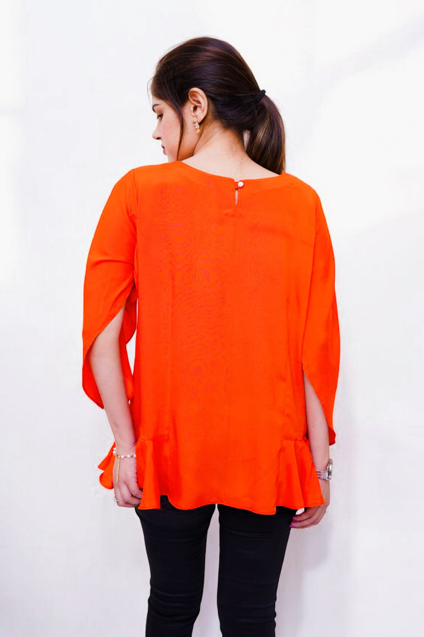 A vibrant orange cape with beautifully designed sleeves. The bold color of the cape is complemented by the intricate sleeve details, adding a touch of elegance and drama to the outfit. Perfect for making a striking and stylish statement
