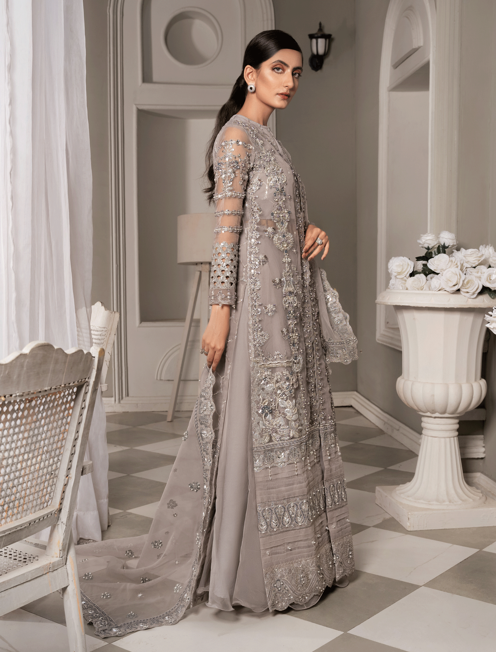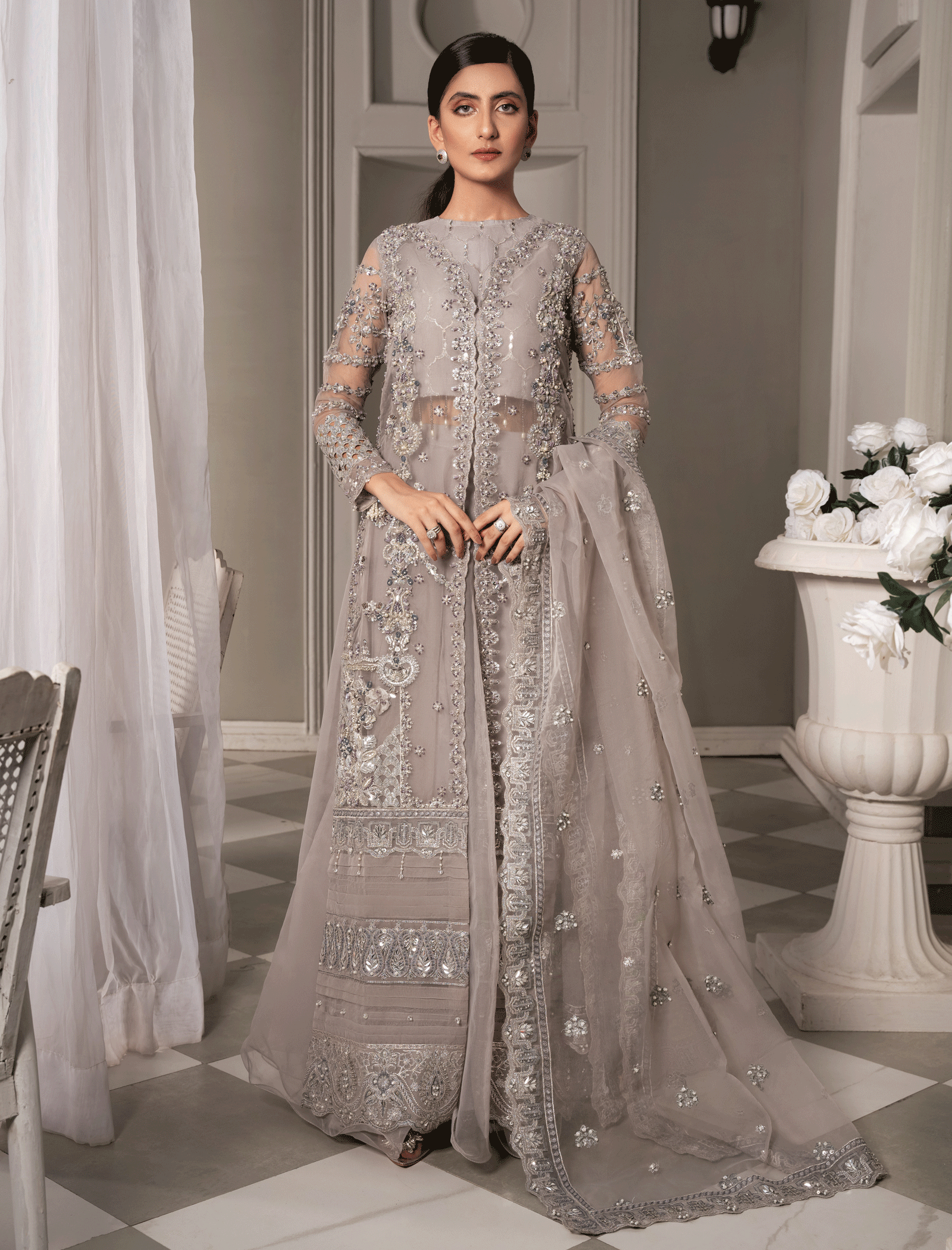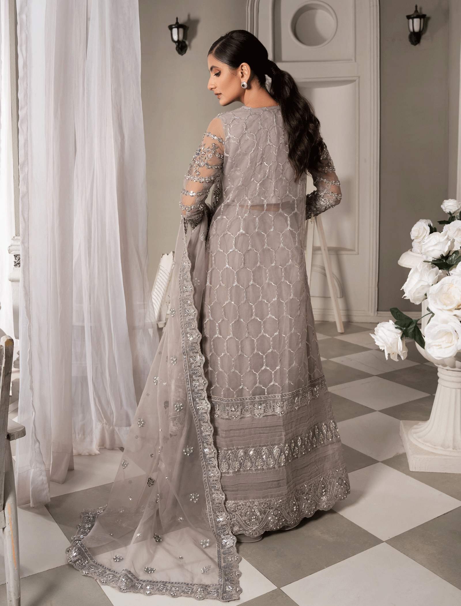 It’s a heavily embellished organza gown and camisole in geometric patterns enhanced by mirror-work pastel embroidery and zardozi work Paired with a fully flared grey organza lehenga. The organza dupatta has heavily embellished borders on all four sides with pearl and motif spray in the middle.