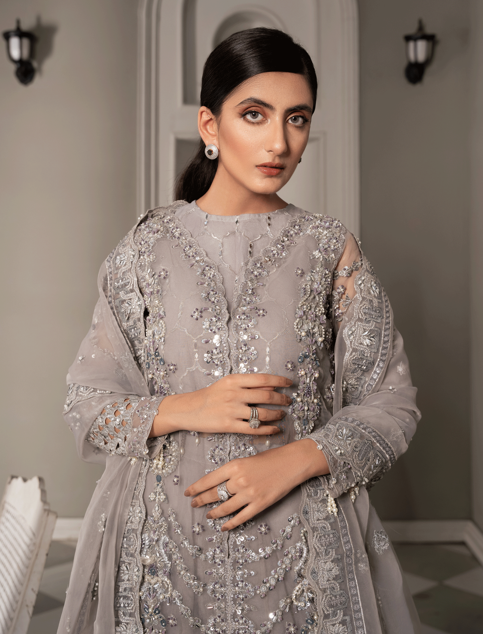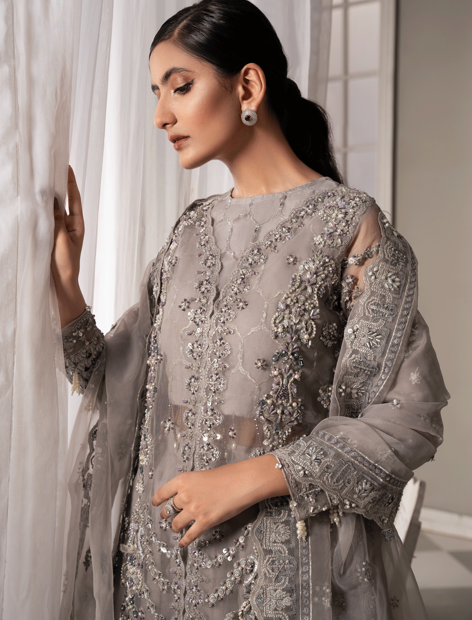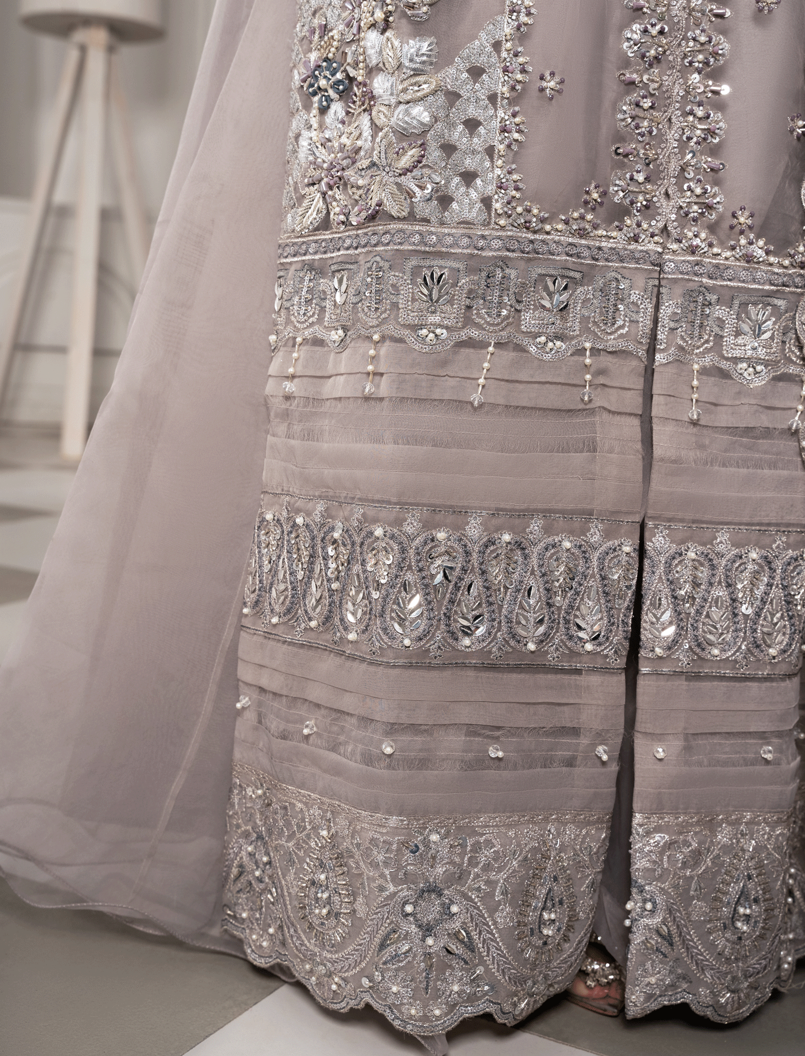 It’s a heavily embellished organza gown and camisole in geometric patterns enhanced by mirror-work pastel embroidery and zardozi work Paired with a fully flared grey organza lehenga. The organza dupatta has heavily embellished borders on all four sides with pearl and motif spray in the middle.