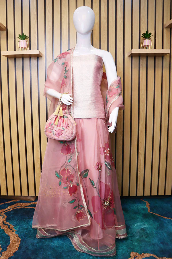Introducing MJ by Madiha Jahangir’s exquisite creation, a mesmerizing ensemble that transcends traditional elegance. This opulent tea pink handcrafted lehenga and cholli set, paired with a designer dupatta and handmade potli, is a testament to Lahore, Pakistan’s rich fashion heritage. The organza lehenga and dupatta exude a timeless charm, while the Jamawar choli boasts intricate gotta work and samosa lace, elevating the ensemble to unparalleled heights of sophistication. The designer dupatta is a canvas of artistry, adorned with maroon-colored flowers and leaves, kiran lace, sequins, gotta work, and tube beads, imparting a regal aura. The hand-painted potli, featuring vibrant flowers, golden strings, sequins, and gotta work, completes this masterpiece, promising a blend of tradition and contemporary allure for the discerning fashion connoisseur. MJ by Madiha Jahangir invites you to embrace the allure of this meticulously crafted ensemble, celebrating Lahore’s enduring fashion legacy