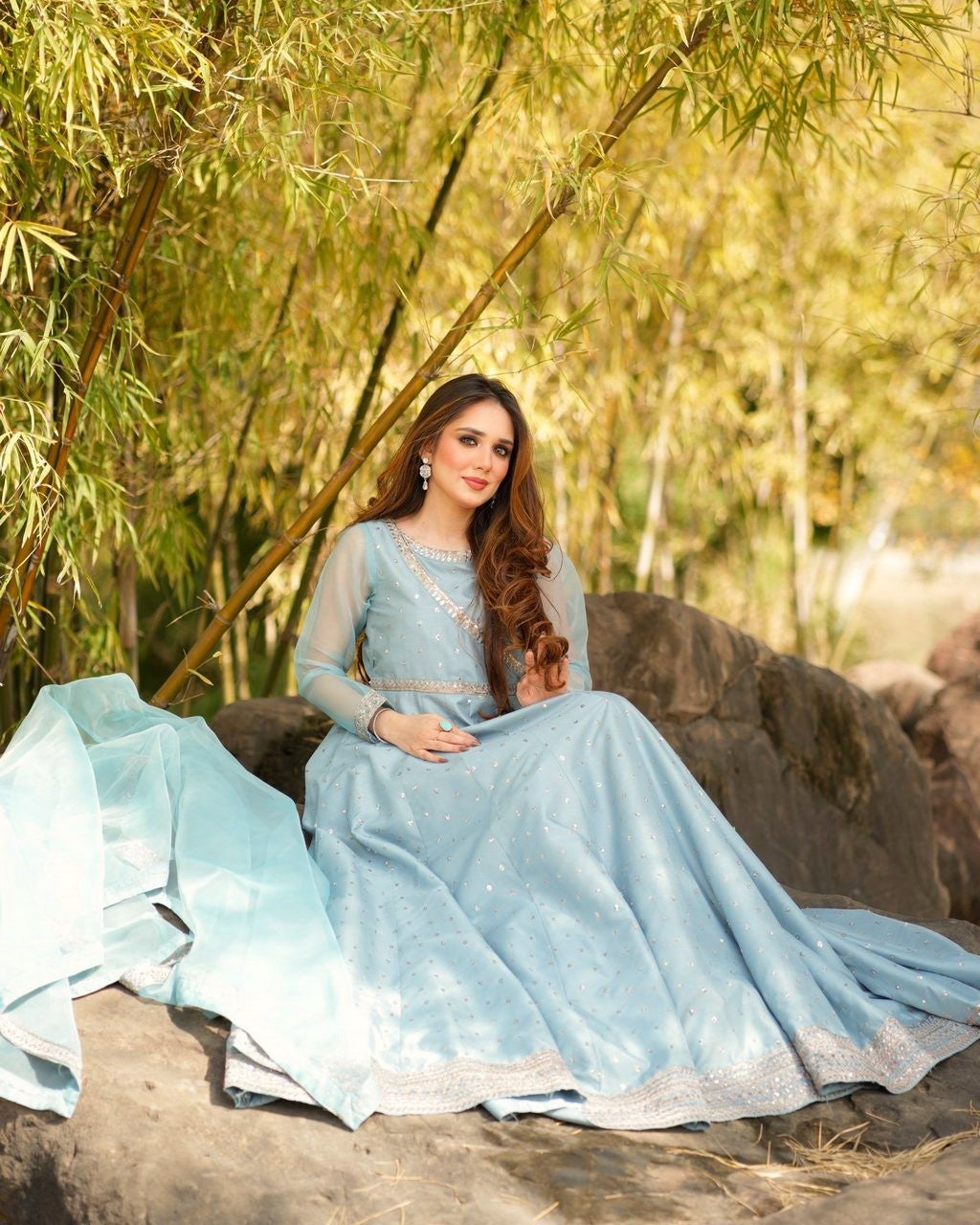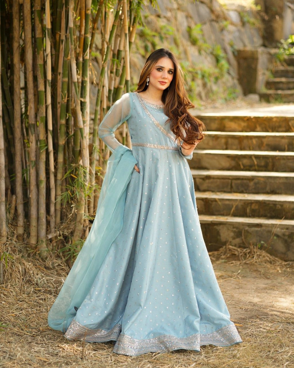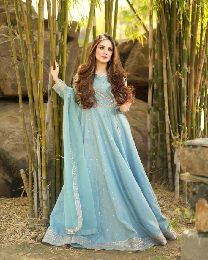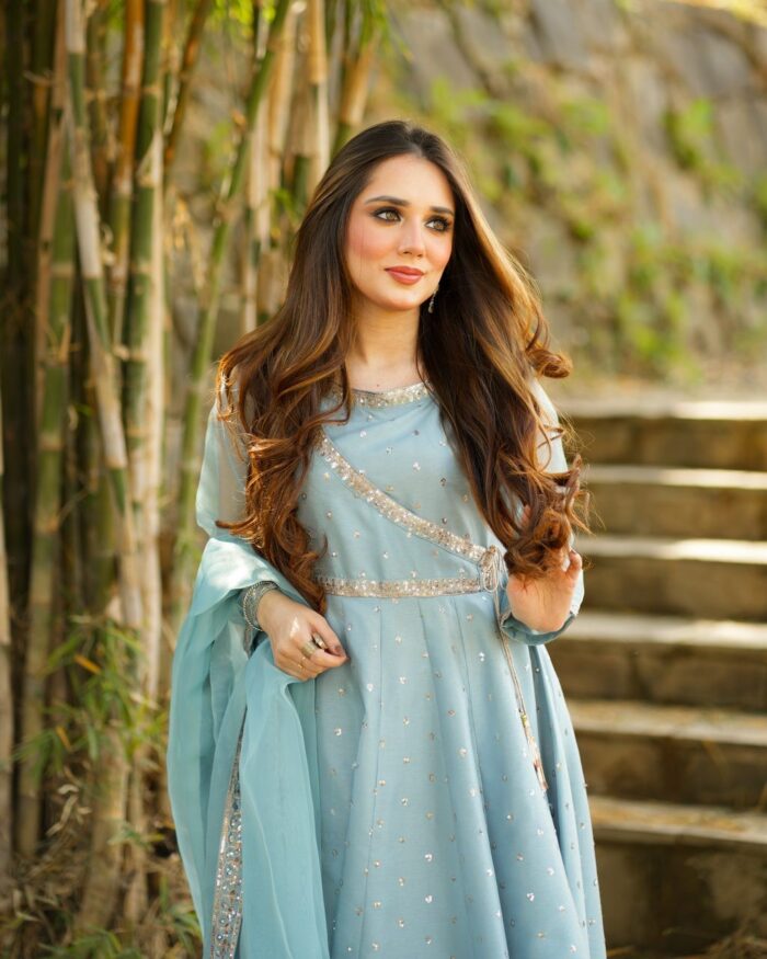 ‘Tehzeeb’ a masterpiece we wanted to share this amazing dress we’ve got for Eid. It’s a gorgeous long flyer frock in mint color, and we’ve done this stunning tilla embroidery with sitara all over it. The border is also decked out with sitara and tilla work, giving it that extra pop. But here’s the unique part – we’ve got this peti with a side style, and the neckline is embellished with beautiful patchwork too. Oh, and let’s not forget the organza dupatta with that delicate sequence patch! Can’t wait to flaunt it during Eid! 🌙✨