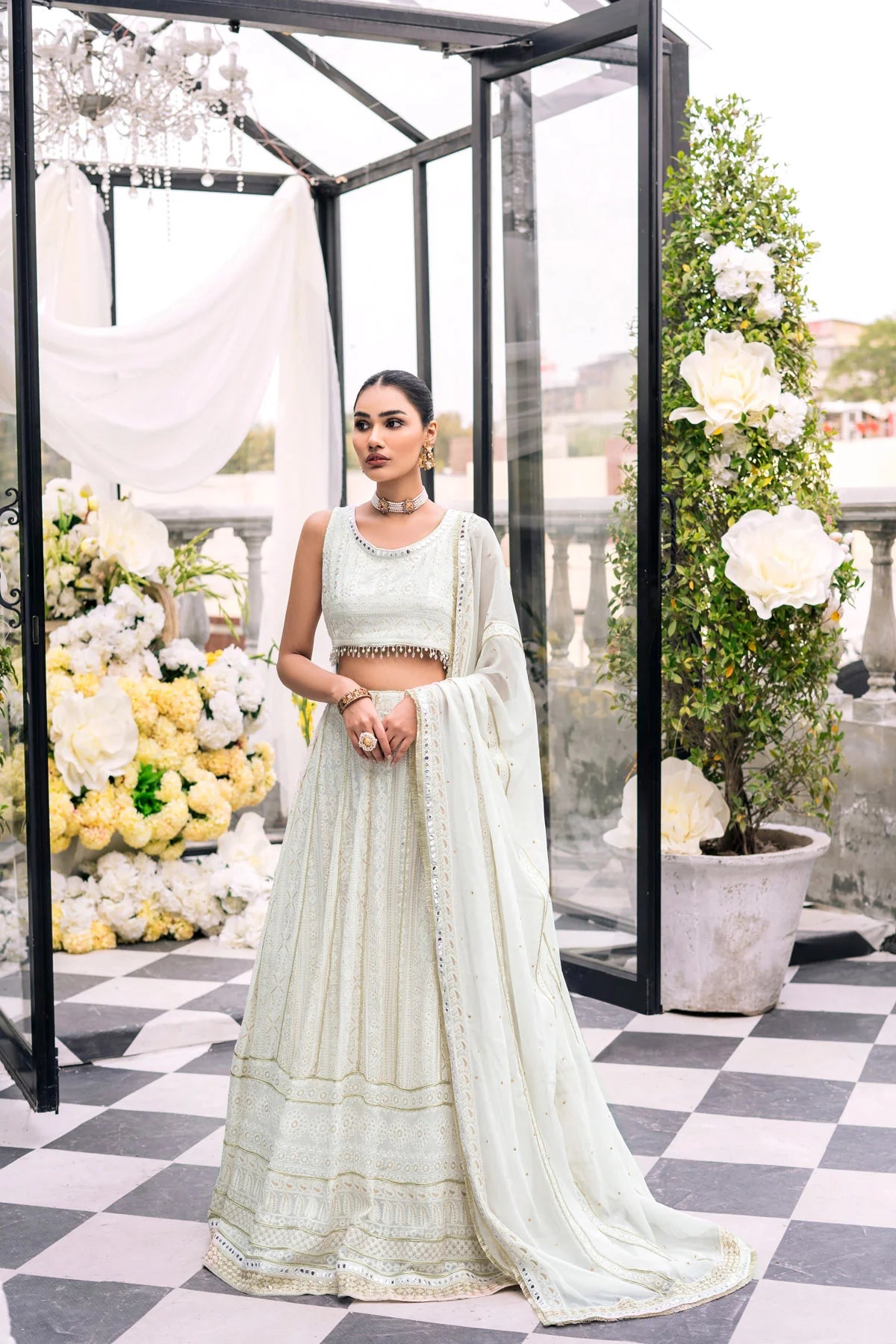 A desi cut with a modern twist, this chicken kari on chiffon lehnga choli is a festive twirl of subtle white shade. The lehnga is deserted with beadwork and patterned embellishments with multi sequins and a hint of aureate separations. The deep round neck choli lined with mirror work and back tied with tussel offers sophistication to your traditional look.