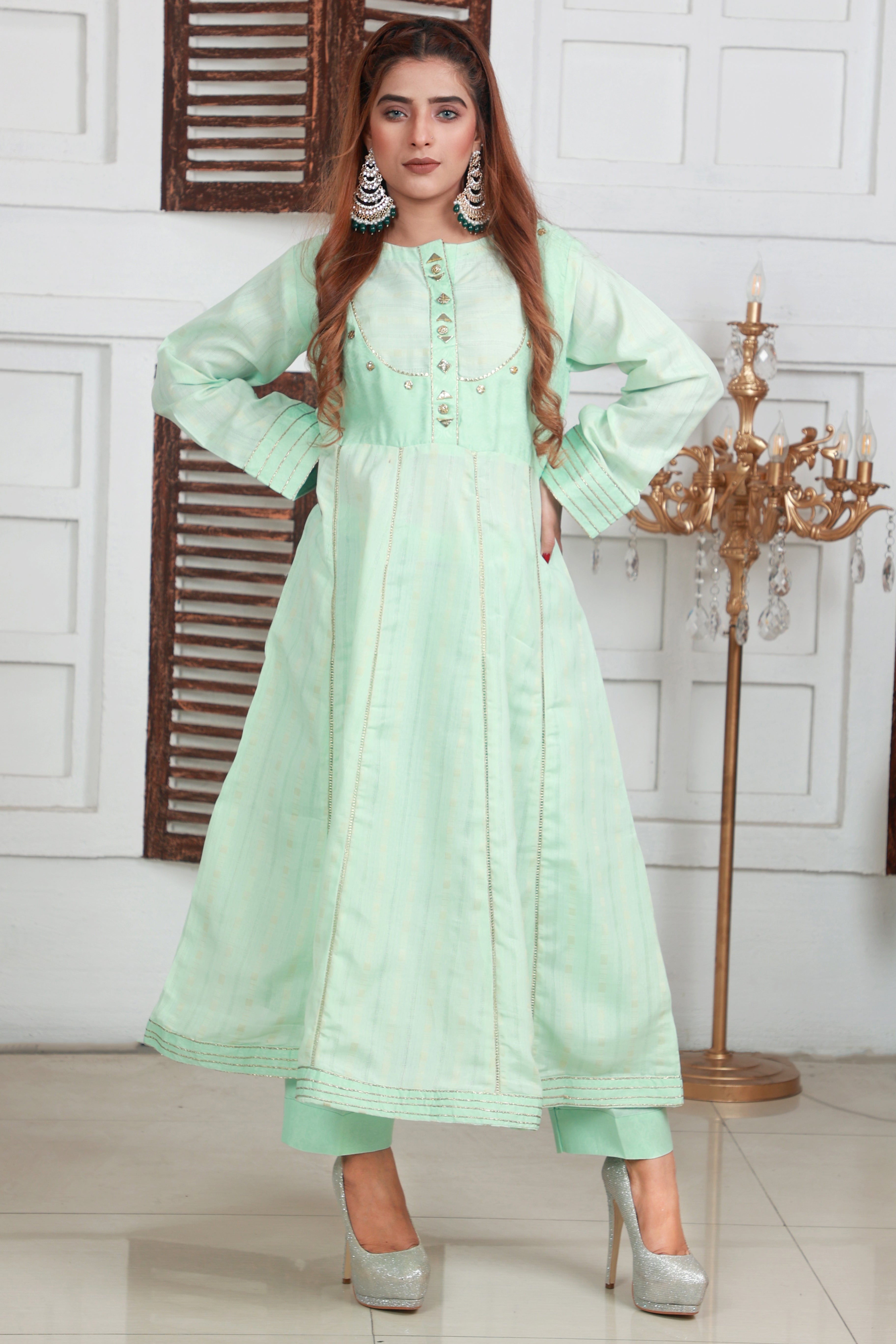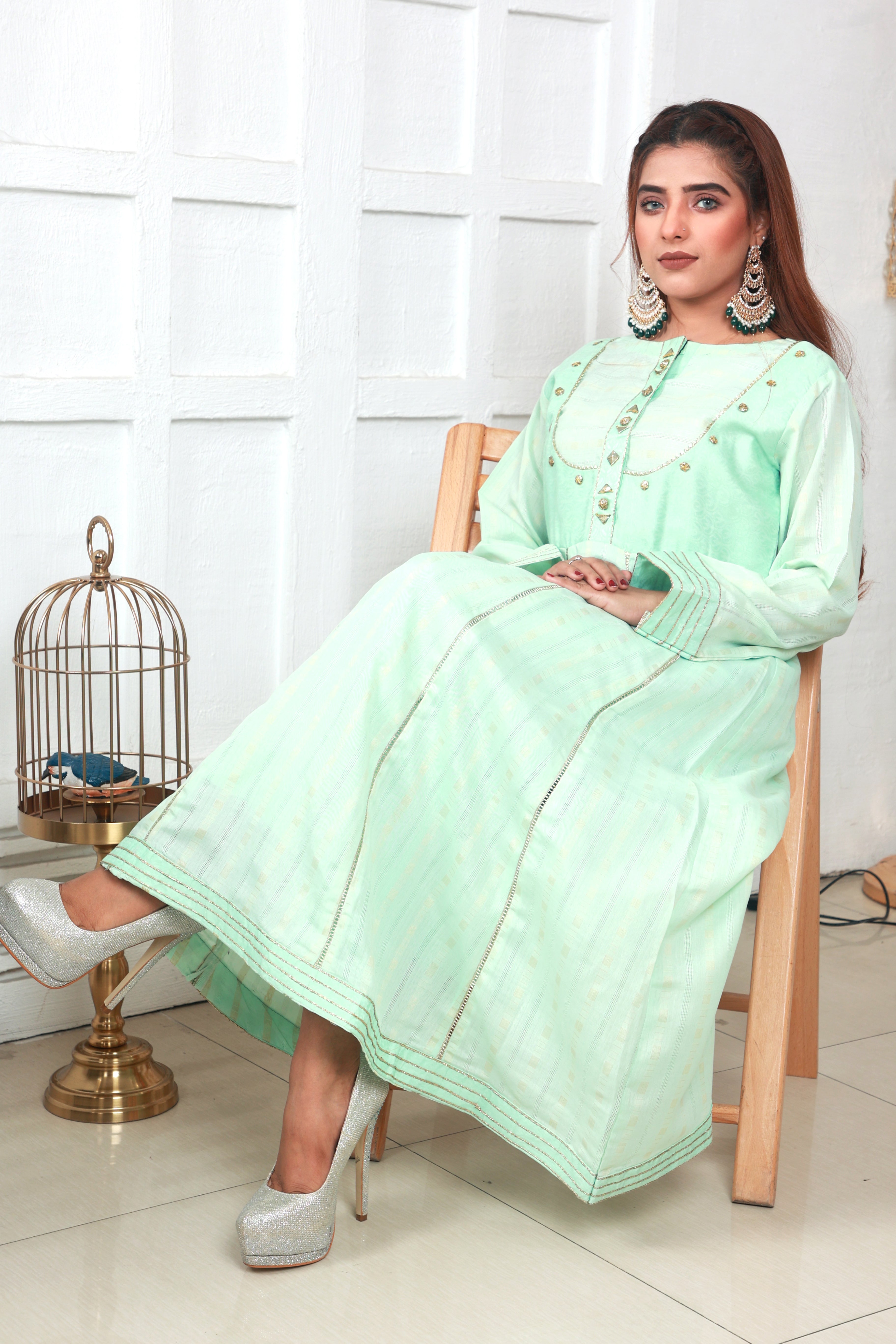 Add a touch of exotic charm to your wardrobe with ' Zara ', our stunning embellished lawn dress in a vibrant pista green hue. The intricate embellishments add a touch of luxury to this elegant design, while the lightweight lawn fabric ensures a comfortable and flowing fit. Perfect for formal events, weddings, or special occasions, ' Zara ' is a breathtaking and sophisticated addition to your wardrobe.