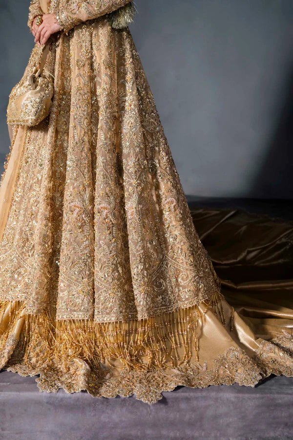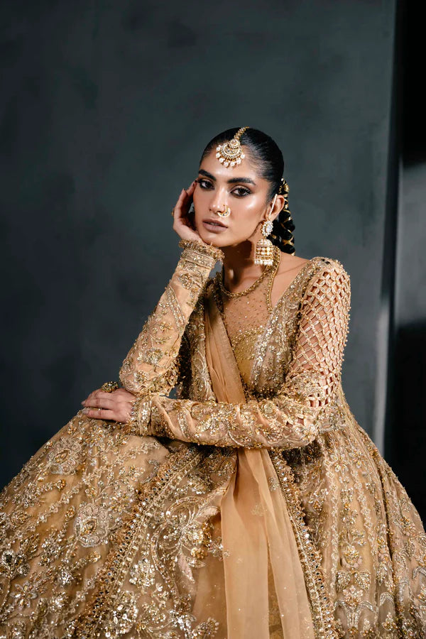 Command attention in this majestic gold bridal lehenga by Akbar Aslam, a true embodiment of traditional luxury. Meticulously hand-embellished with intricate zardozi, sequins, and resham work, the ensemble showcases a richly adorned bodice and a grand, flared skirt finished with a silk hem and delicate beaded fringes. The matching dupatta, detailed with scalloped borders and ornate embroidery, drapes gracefully for a timeless silhouette. Paired with a handcrafted pouch, this ensemble is designed to make a bold, elegant statement for the bride on her most special day.