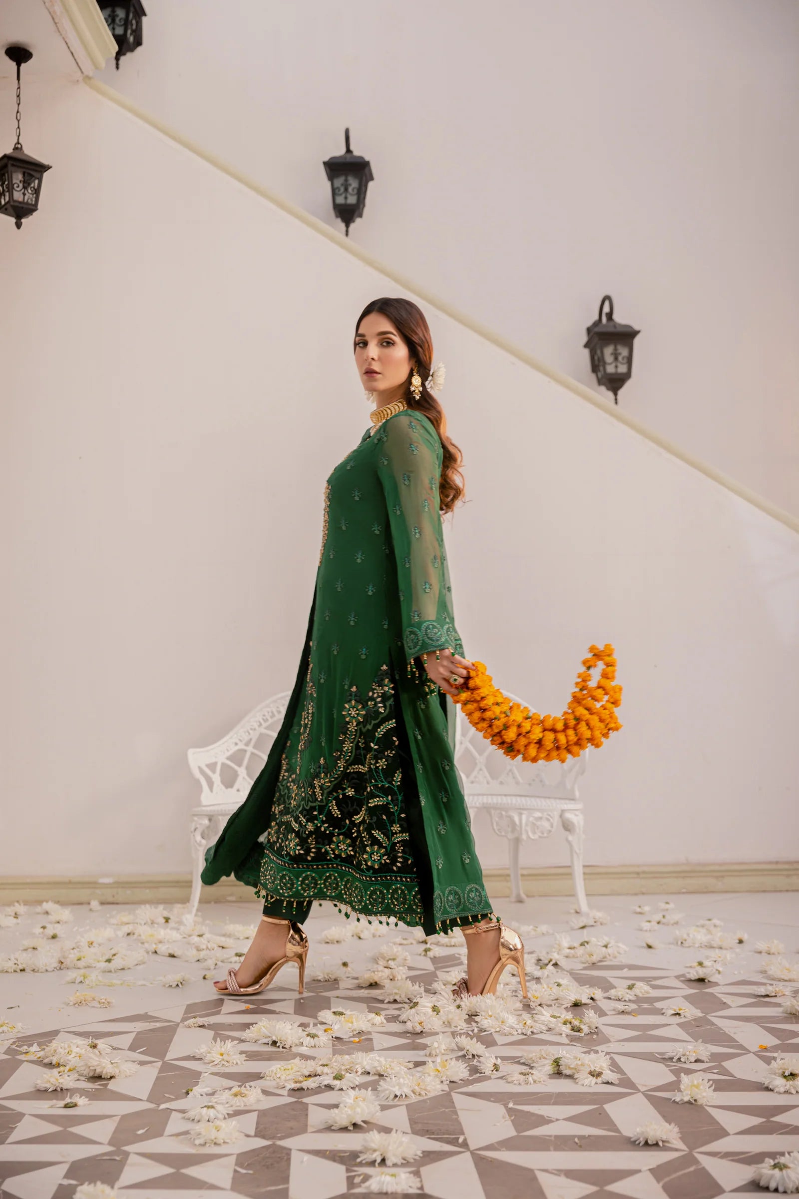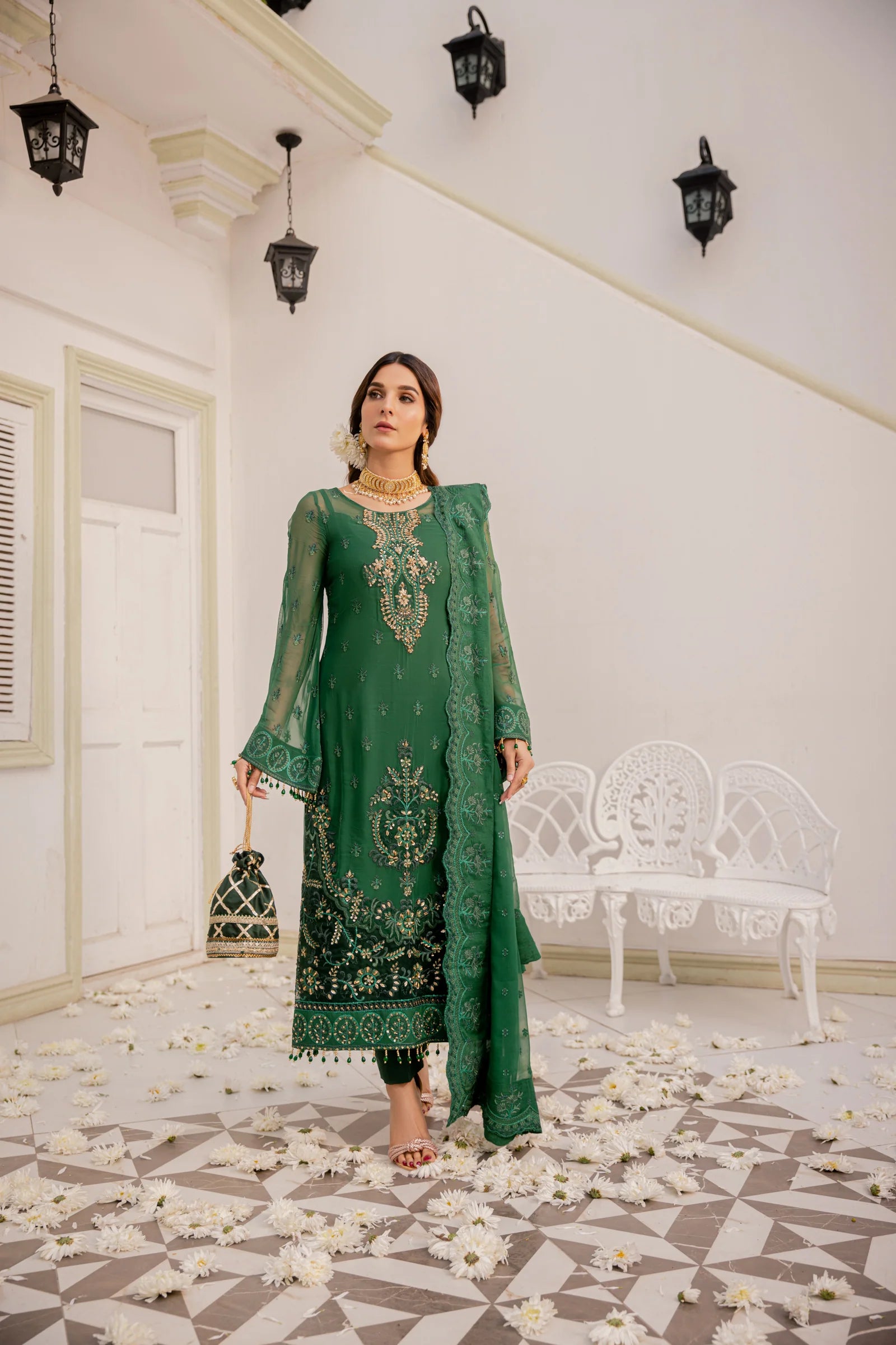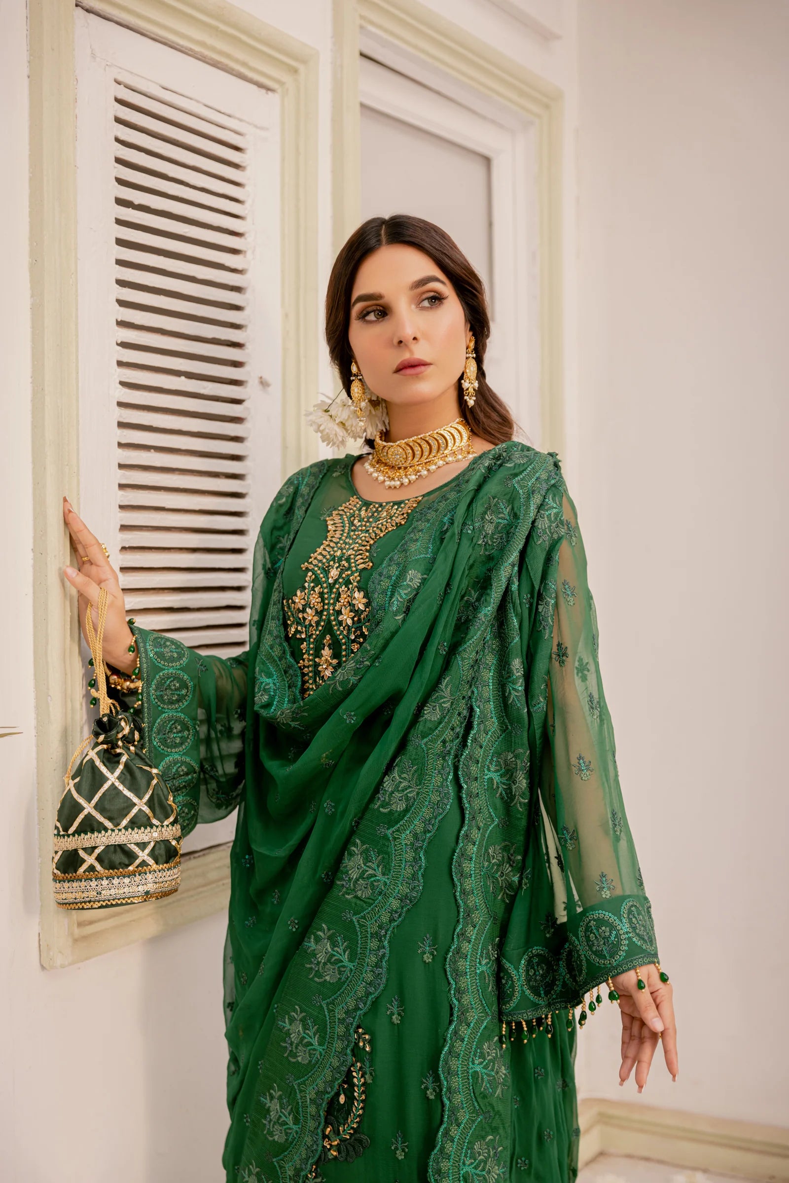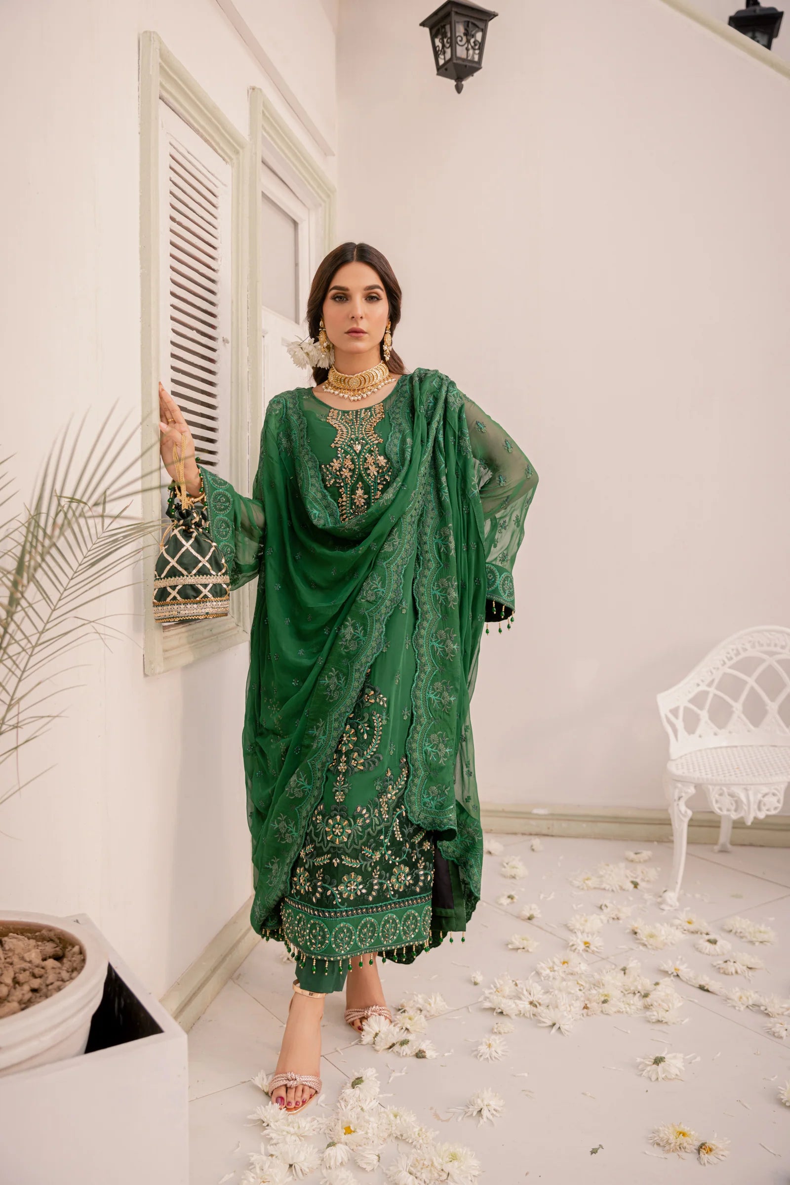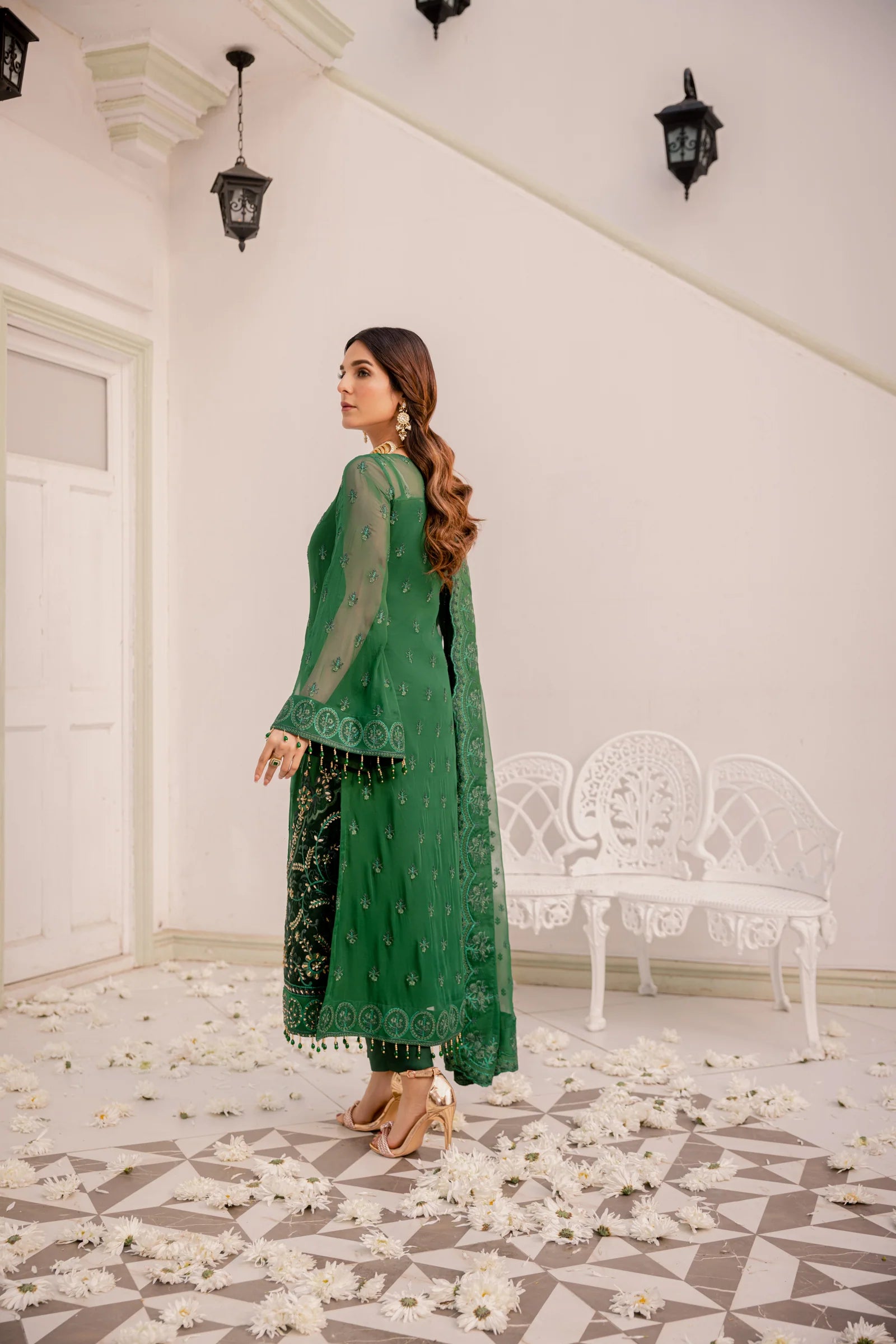 Embroidered hand embellished front border organza