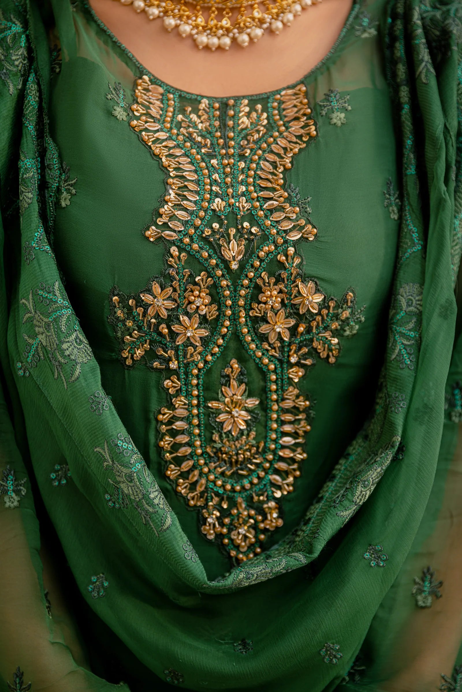 Embroidered hand embellished neckline organza