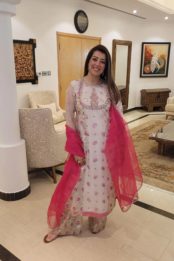 This off-white frock is a stellar piece for your festive wardrobe. The dress features pink motifs and golden lacework on an off-white base paired with printed palazzo pants.